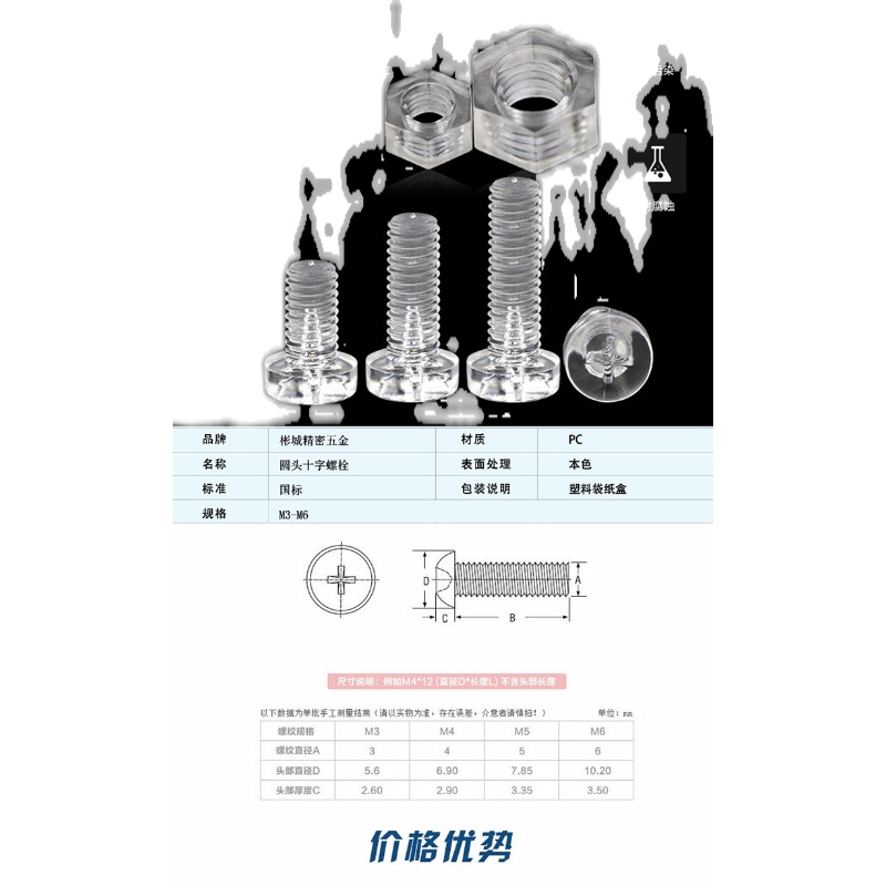 () transparent screw acrylic powerful screw process screw DIY screw fastener M3M4 straight