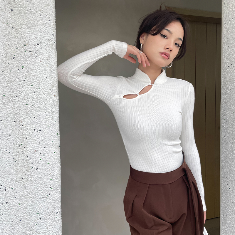 LEIYU Knitted Leggings Women's Tight 2022 Winter New Cheongsam Collar Design Sense Inner Long Sleeve Top Ins