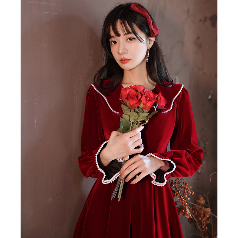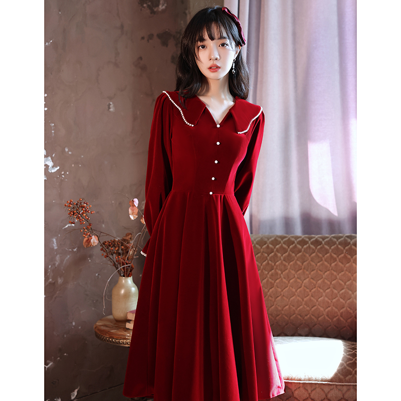 Toast to the bride The bride is usually able to wear the winter wine red color engagement foreign dress wedding gown velvet dress.