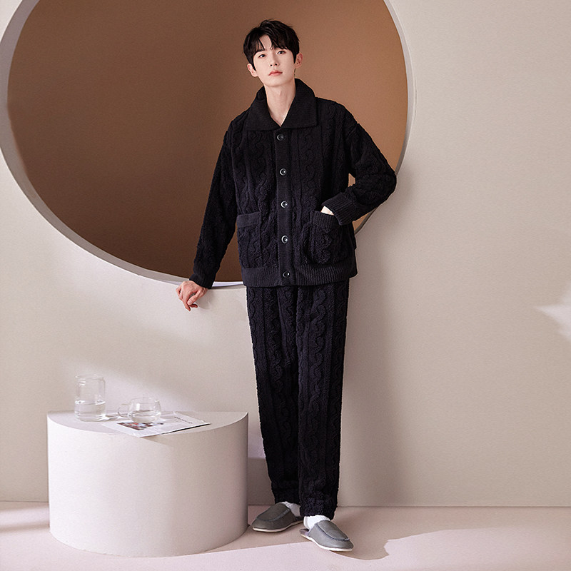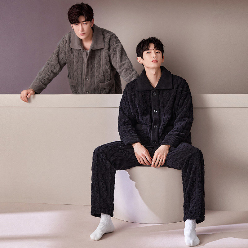 Coral velvet men's pajamas autumn and winter thickened and velvet flannel warm youth home clothes two-piece suit