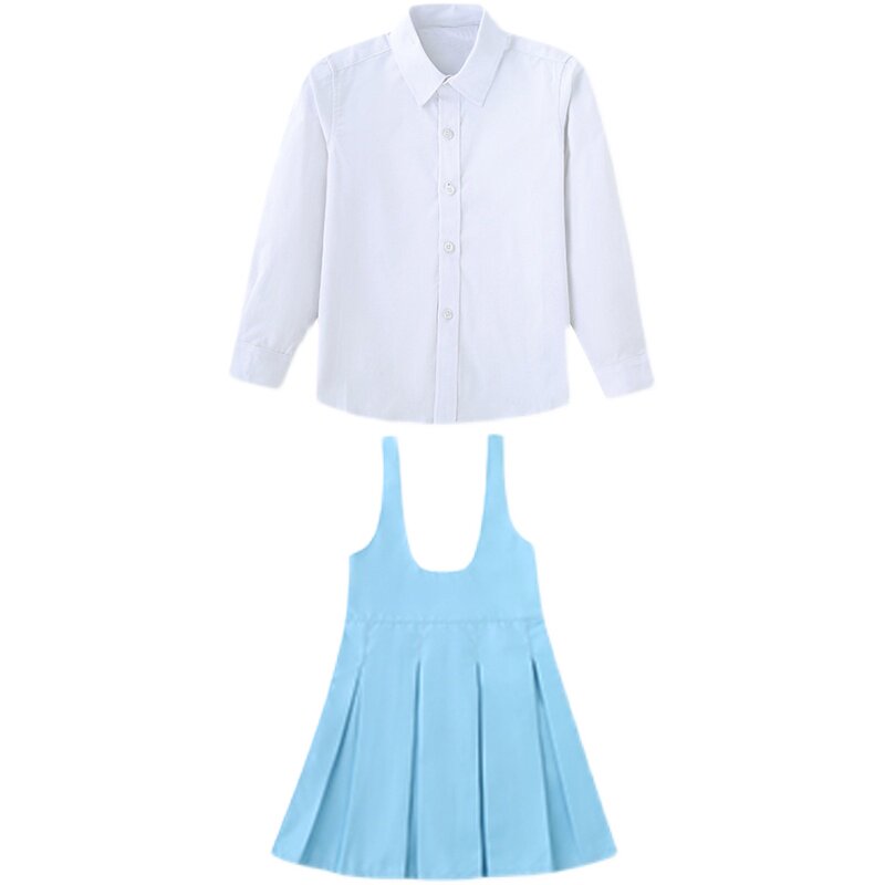Women's (shirt, skirt), men's (shirt, trousers), white shoes