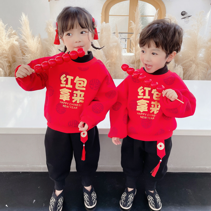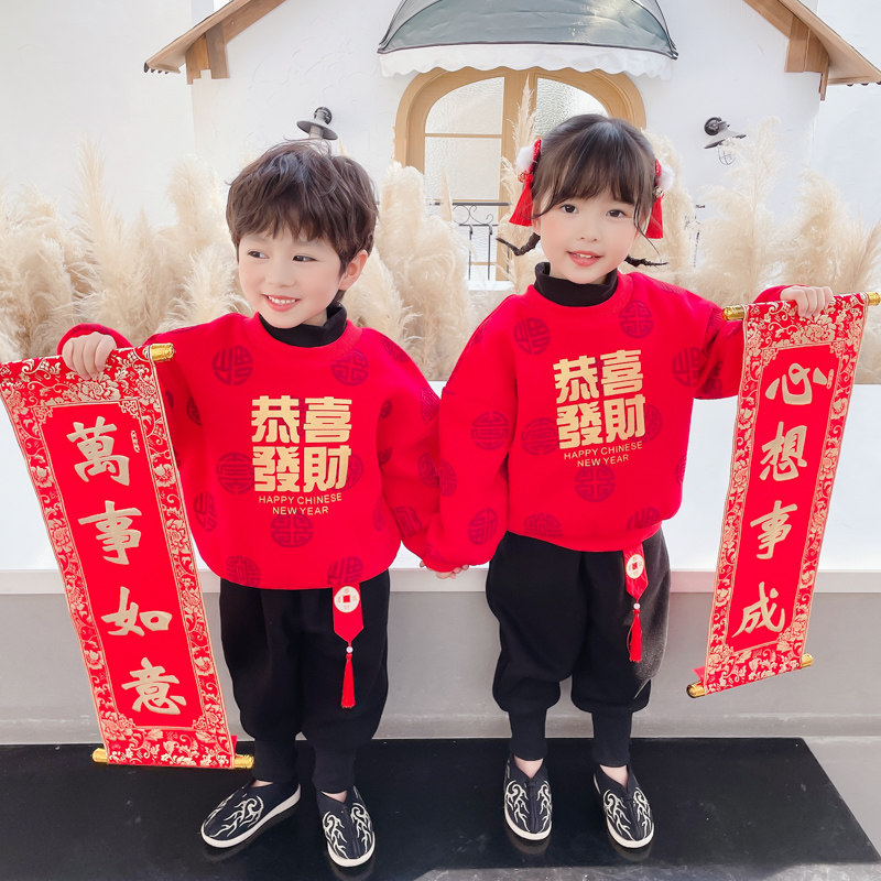 Children's festive New Year's Day performance clothes plus velvet sweater suit baby red performance clothes chorus New Year's clothing sister and brother clothes