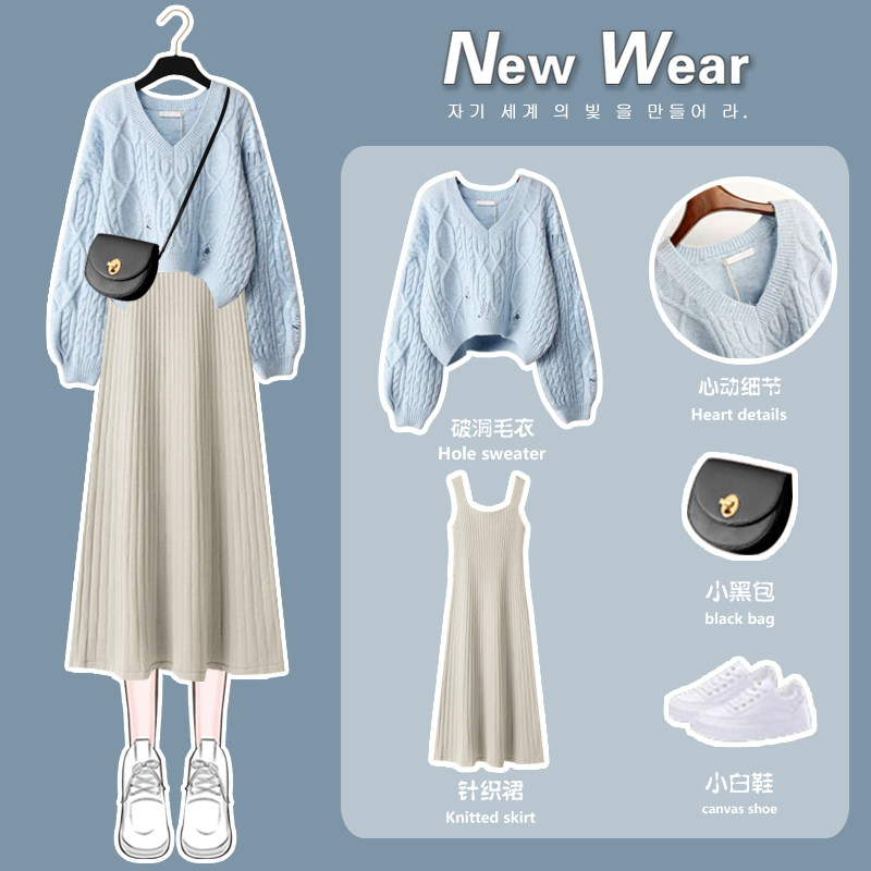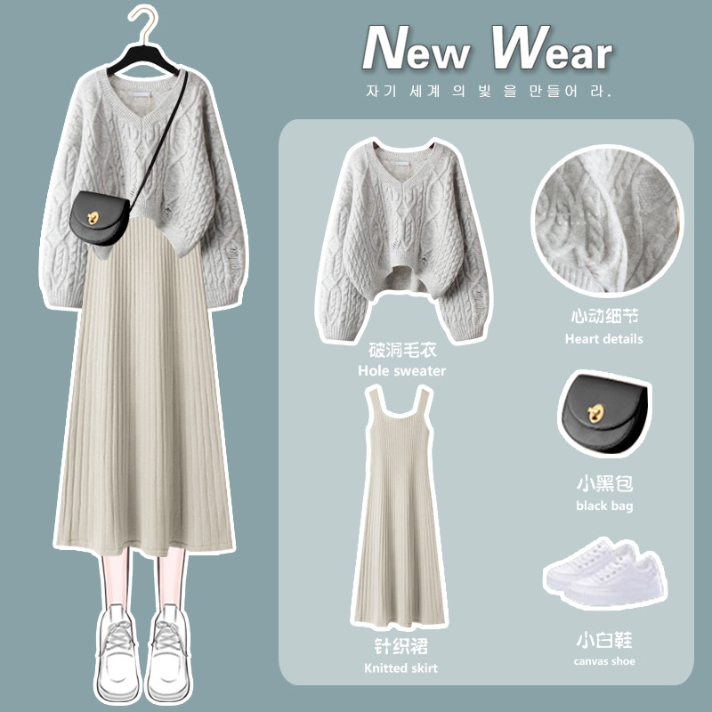 Gentle wear Hepburn style knitted dress women's autumn and spring white sweater skirt mid-length version two-piece small man