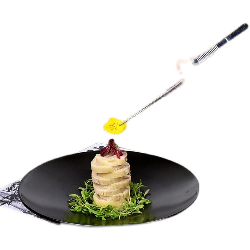 Chef Chinese and Western cold dishes plating decorated with stainless steel tweezers molecular cooking tools sandwich Michelin restaurant