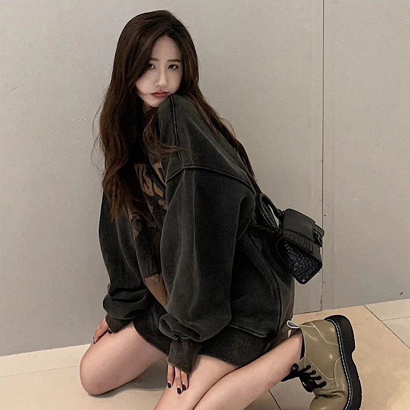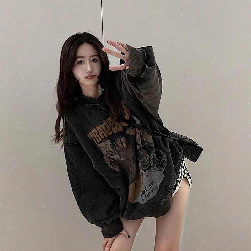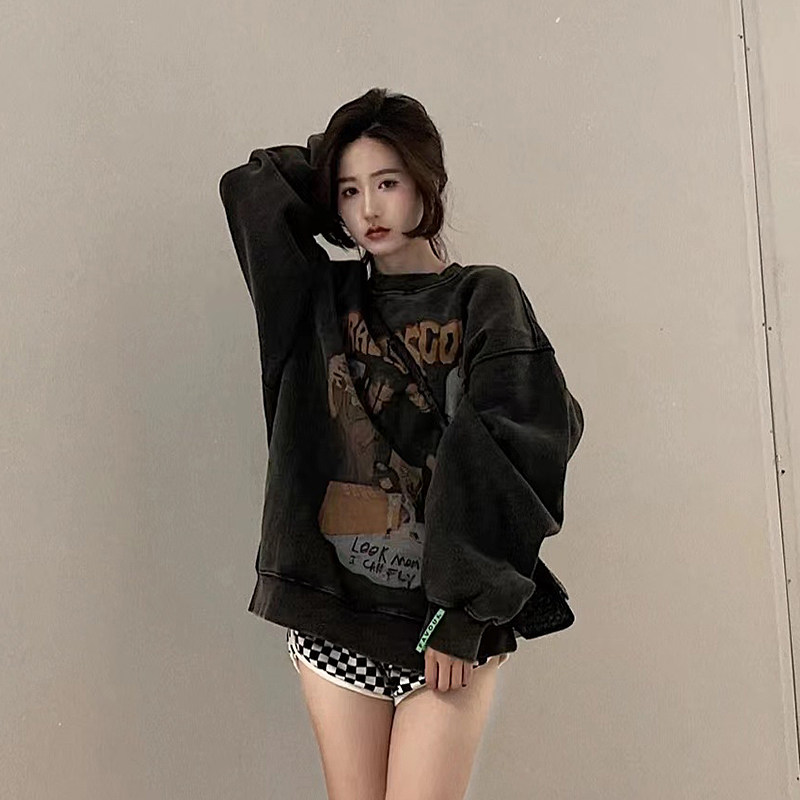Autumn and winter couple atmosphere wear genderless hip-hop spray retro high street washed old plus velvet pullover casual top