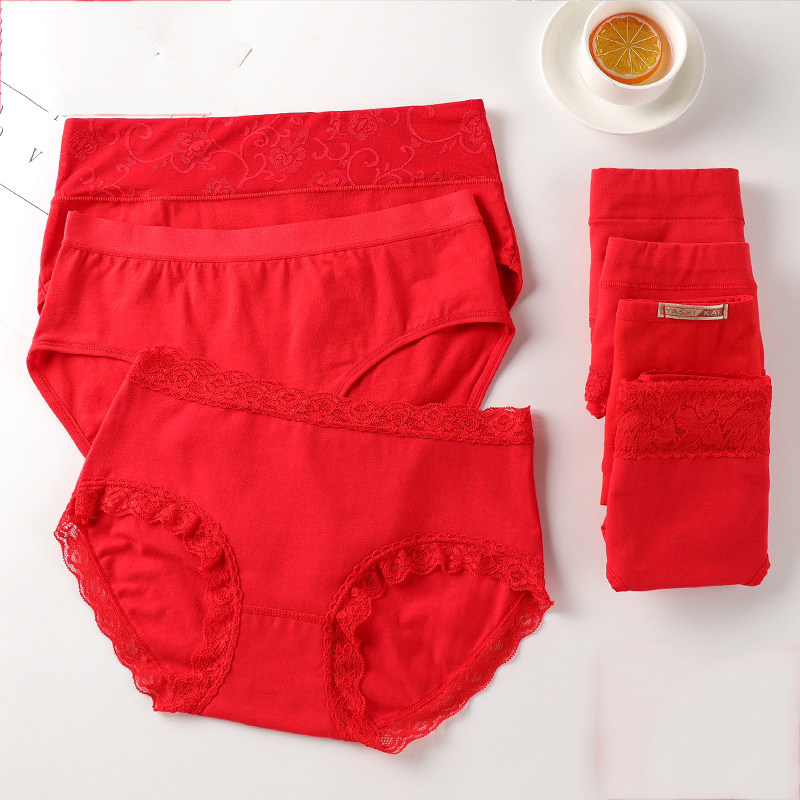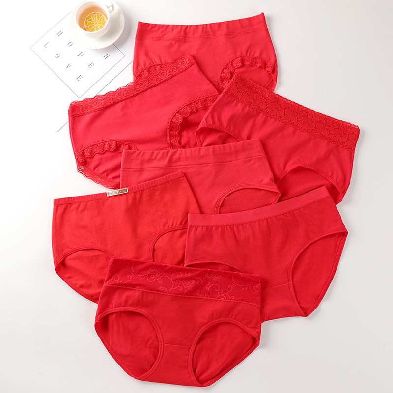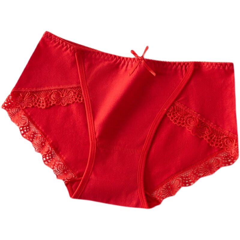 Zodiac year big red underwear ladies pure cotton mid-high waist sexy lace cotton thin bride wedding briefs