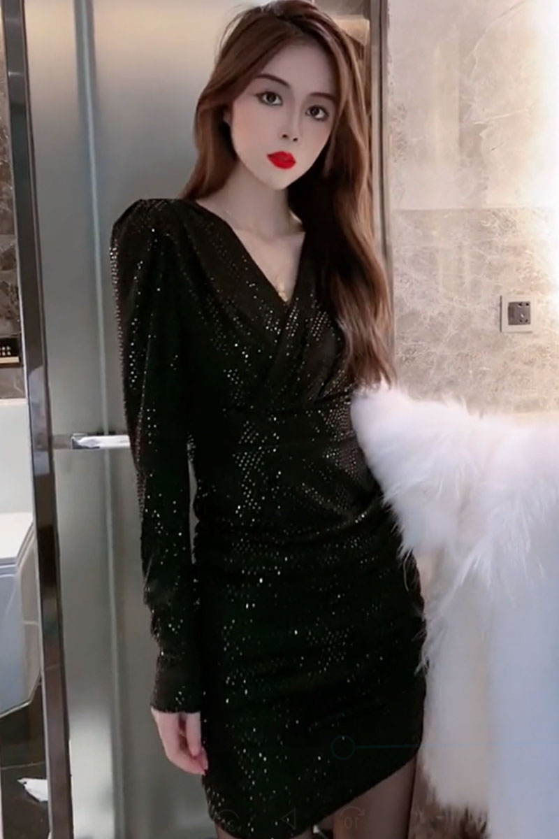 Fat mm French temperament bottoming with a dress 2021 autumn and winter new V-neck slim fit and slim sequined hip skirt