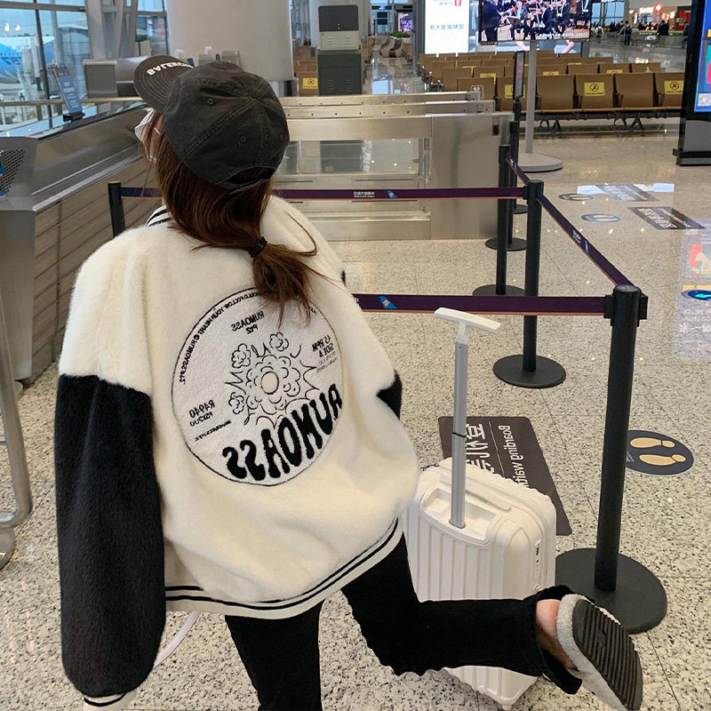 2022 new small American retro baseball uniform plus velvet thickened small fragrant lamb wool coat women's autumn and winter