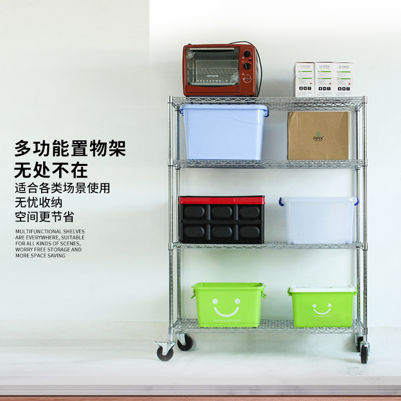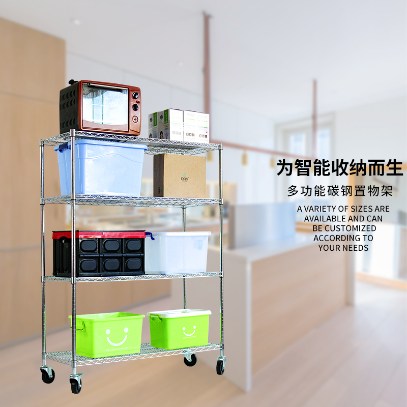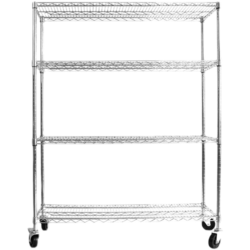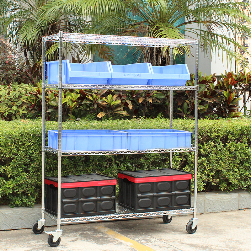 Guangdong stainless steel chromed antistatic metal multilayer wire mesh stock goods Show weekly transfer warehouse shelf with wheels
