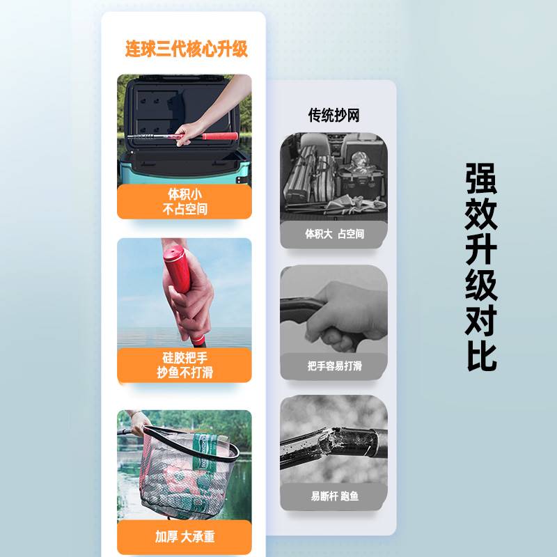 It can be put into the fishing box Three generations of the netting rod (without the mesh head) can be put into the fishing box for three generations of the netting suit (with 40cm mesh head)