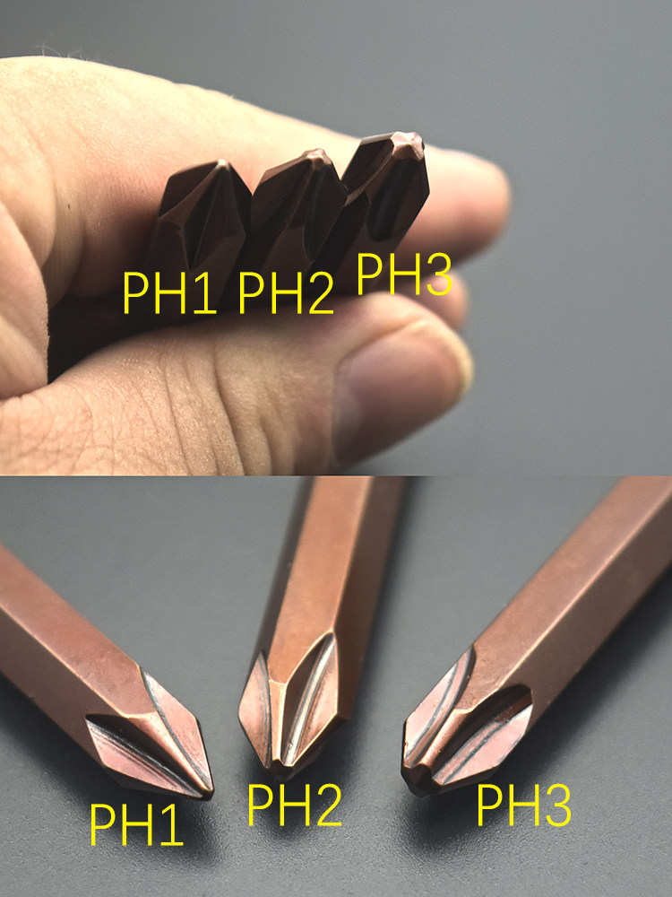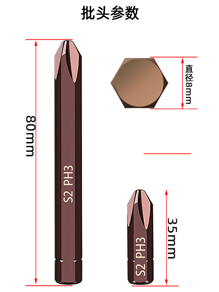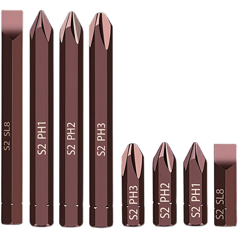 8 sets of commonly used impact bits, 3 sets of 35mm short crosses (PH1 PH2 PH3), 3 sets of 80mm long crosses (PH1 PH2 PH3), 4 sets of short bits