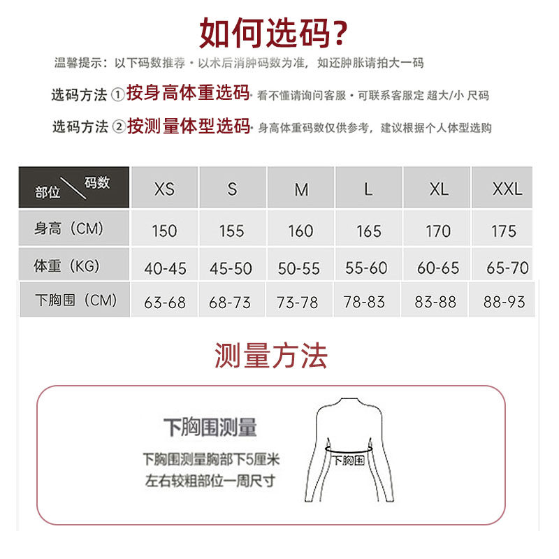 XS (recommended for chest circumference 65-70) S (recommended lower chest circumference 70-75) M (recommended for lower chest circumference 75-80) L (recommended for lower chest circumference 80-85) XL (recommended lower chest)