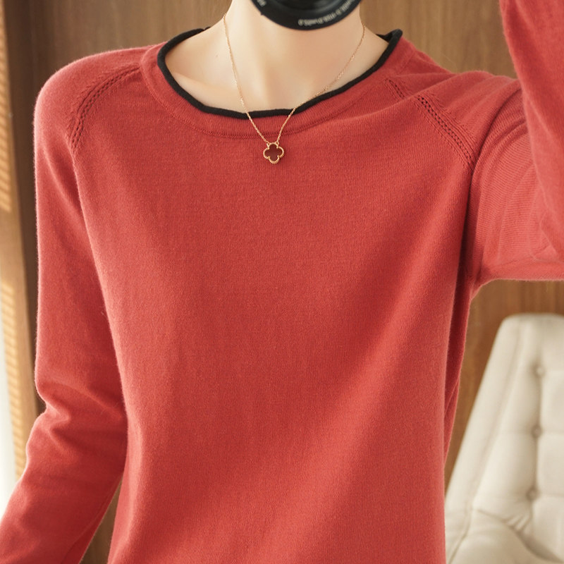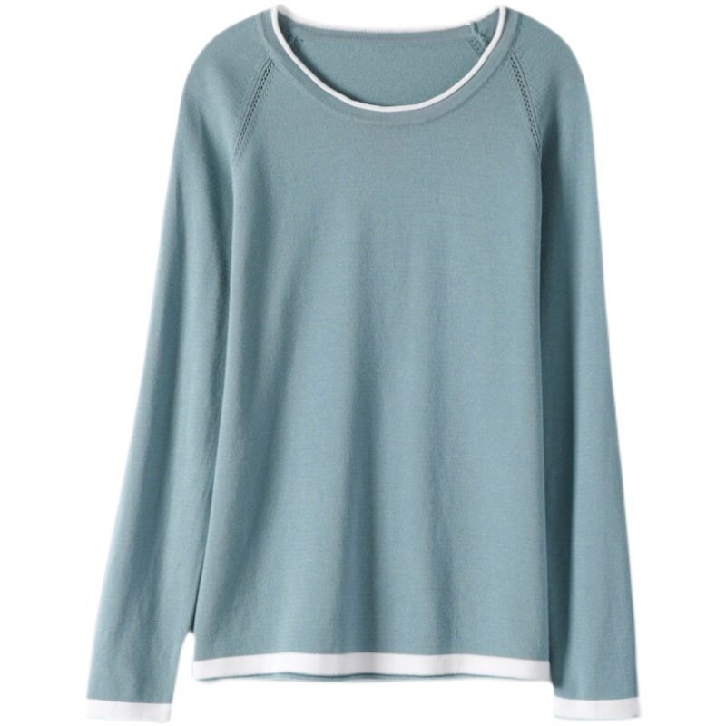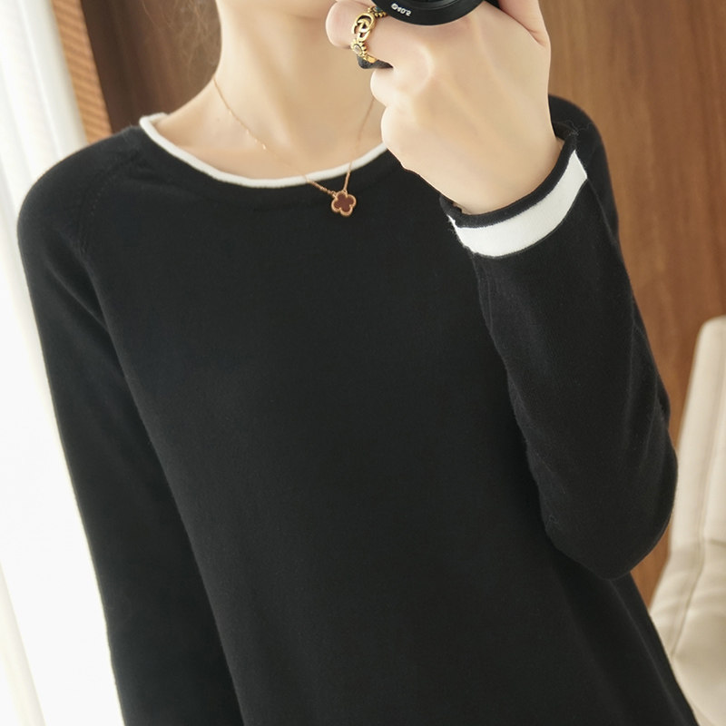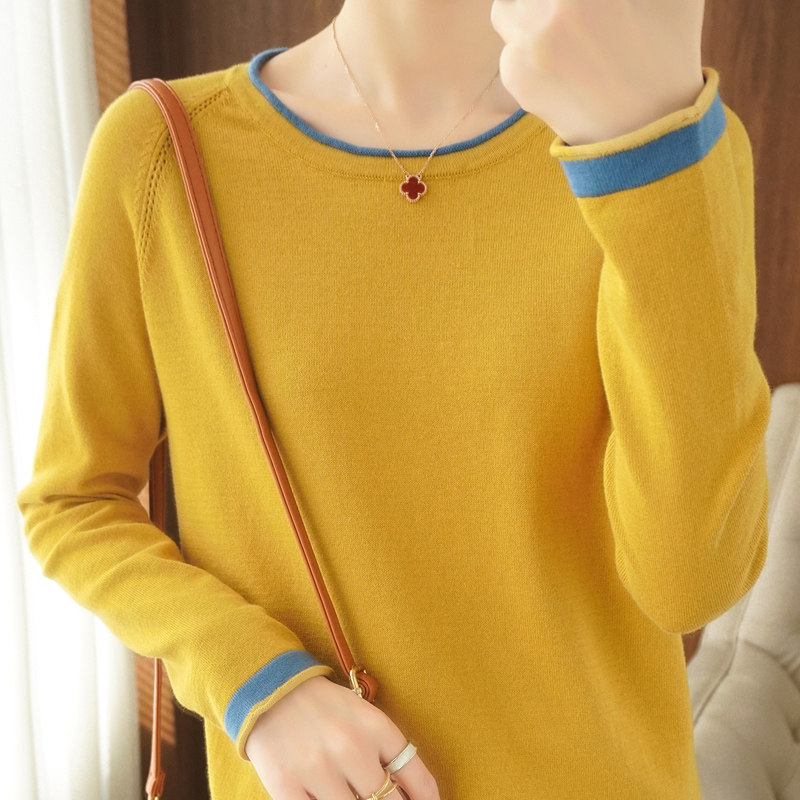 100% pure cotton knitted sweater women's long-sleeved round neck pullover short top spring and autumn thin section loose bottoming sweater