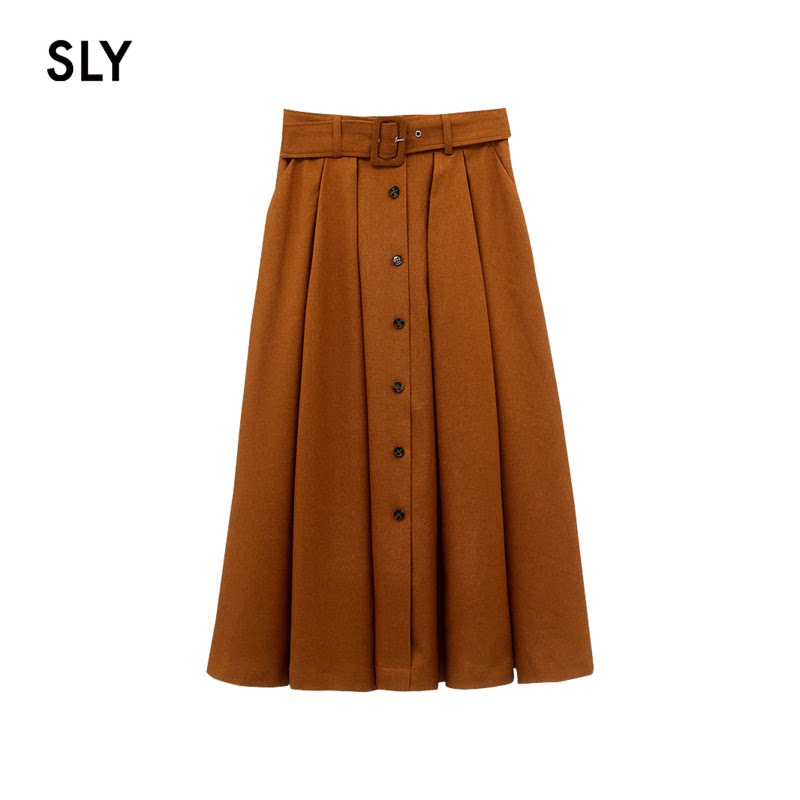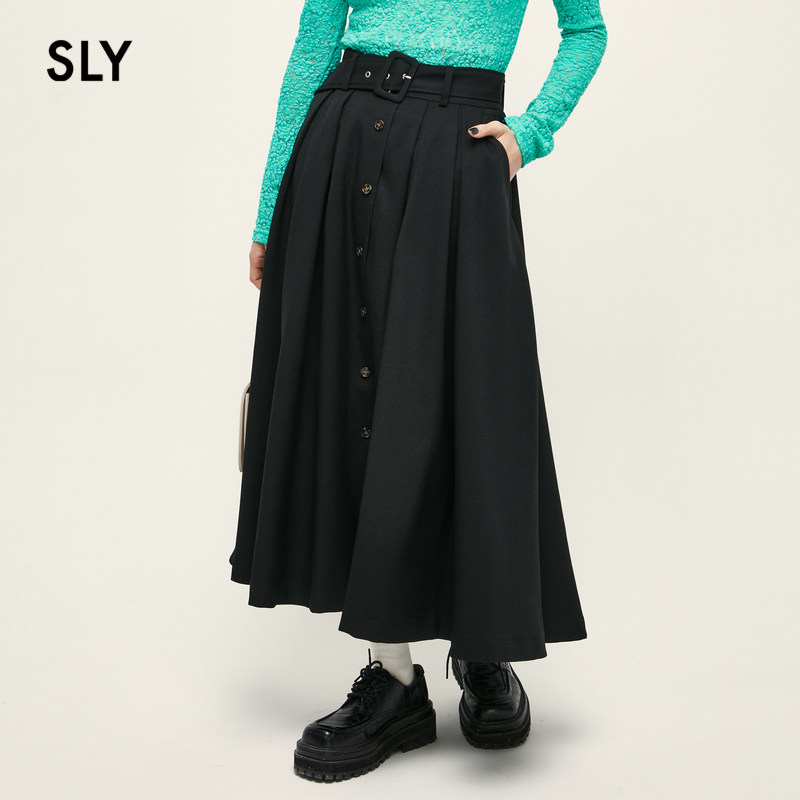 SLY autumn new retro high waist belt A-word mid-length skirt female 038EAL31-7350