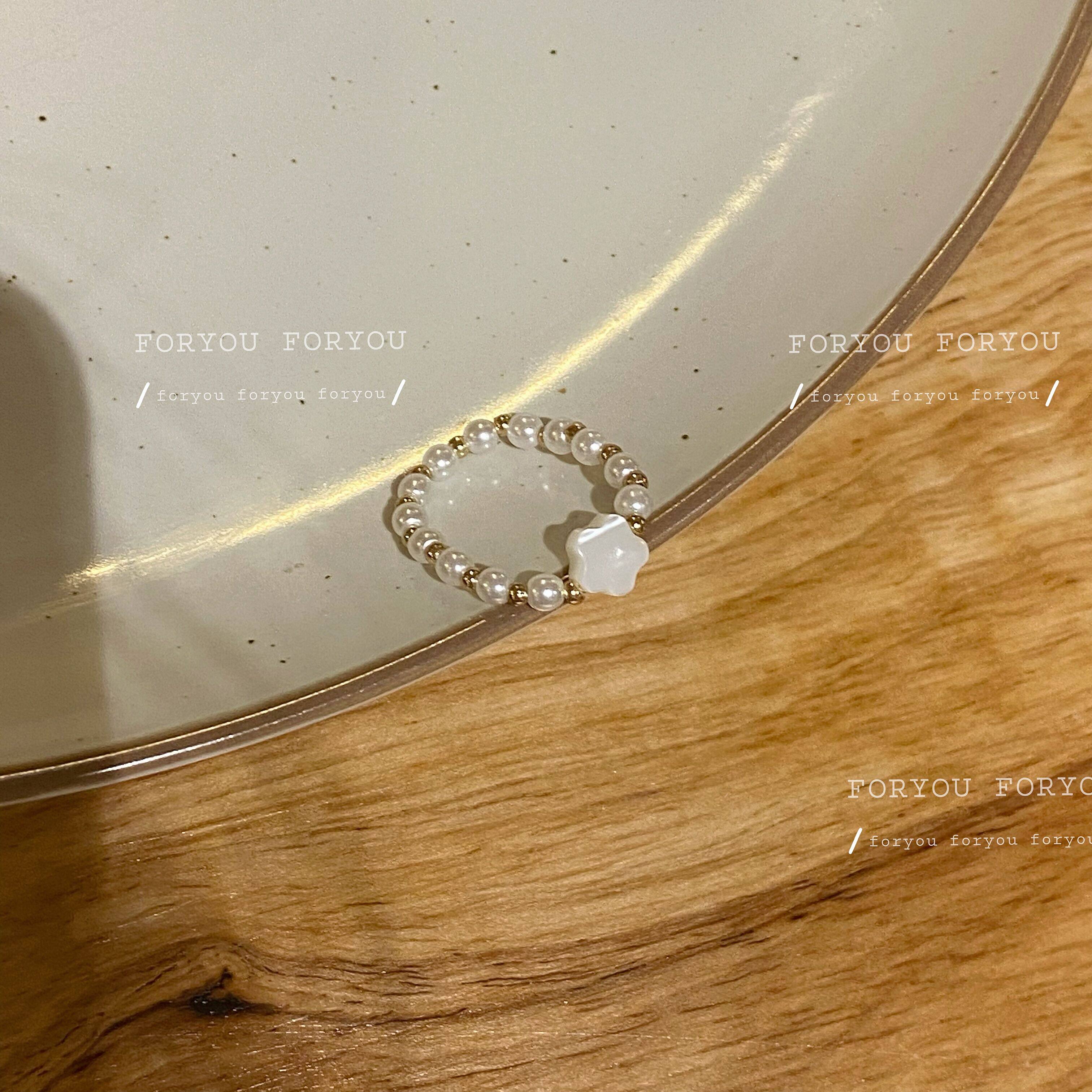 Retro gentle flowers ring Japan-ROK brief sweet and beautiful pearl beads index finger ring cute teenage girl elastic ring
