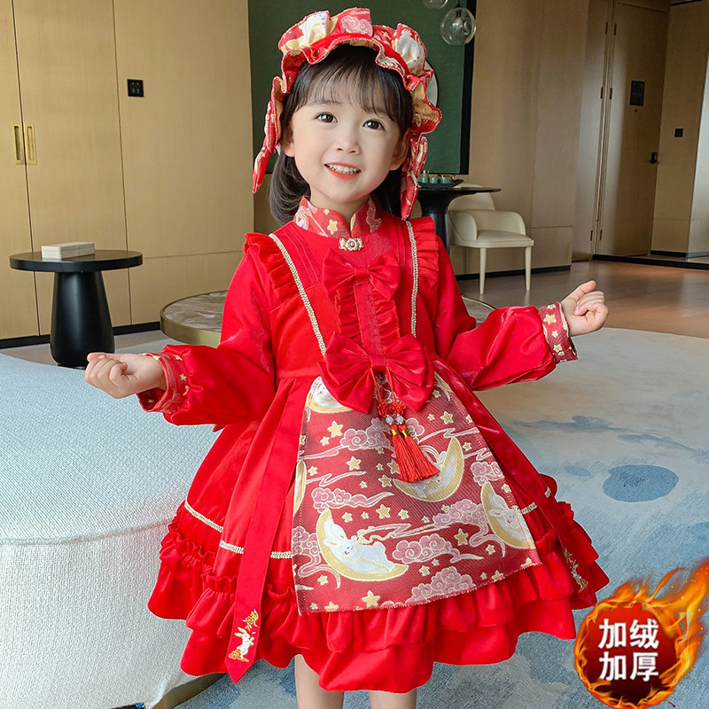 Lolita girls dress autumn and winter children's skirt winter style plus velvet baby princess skirt children's New Year's dress