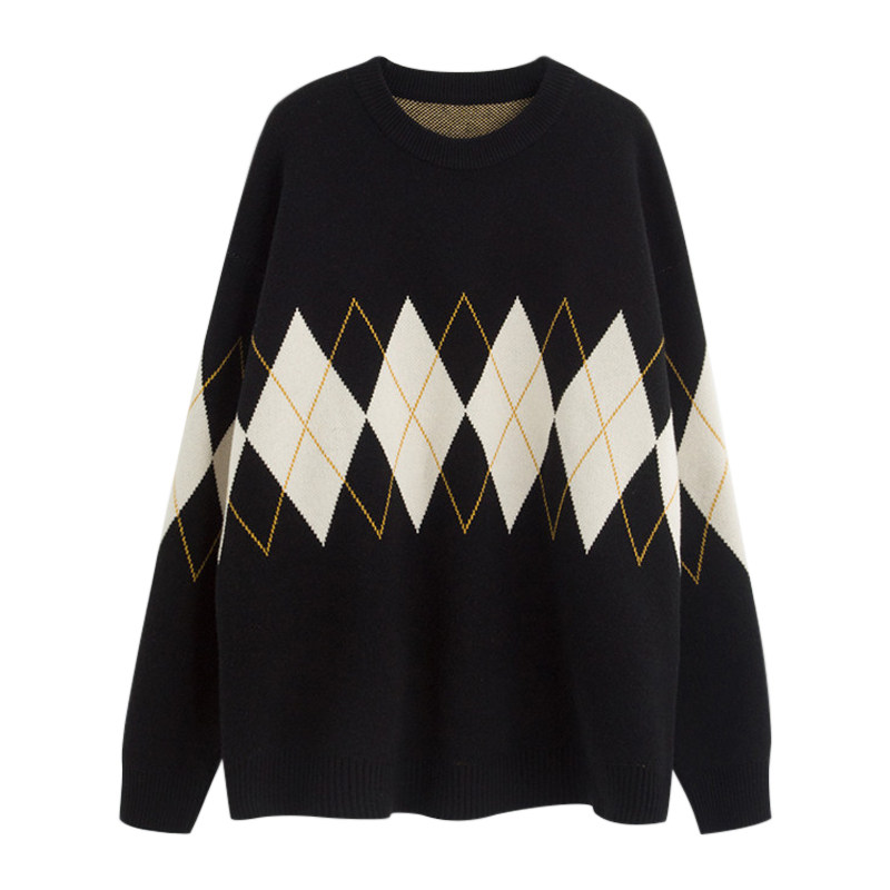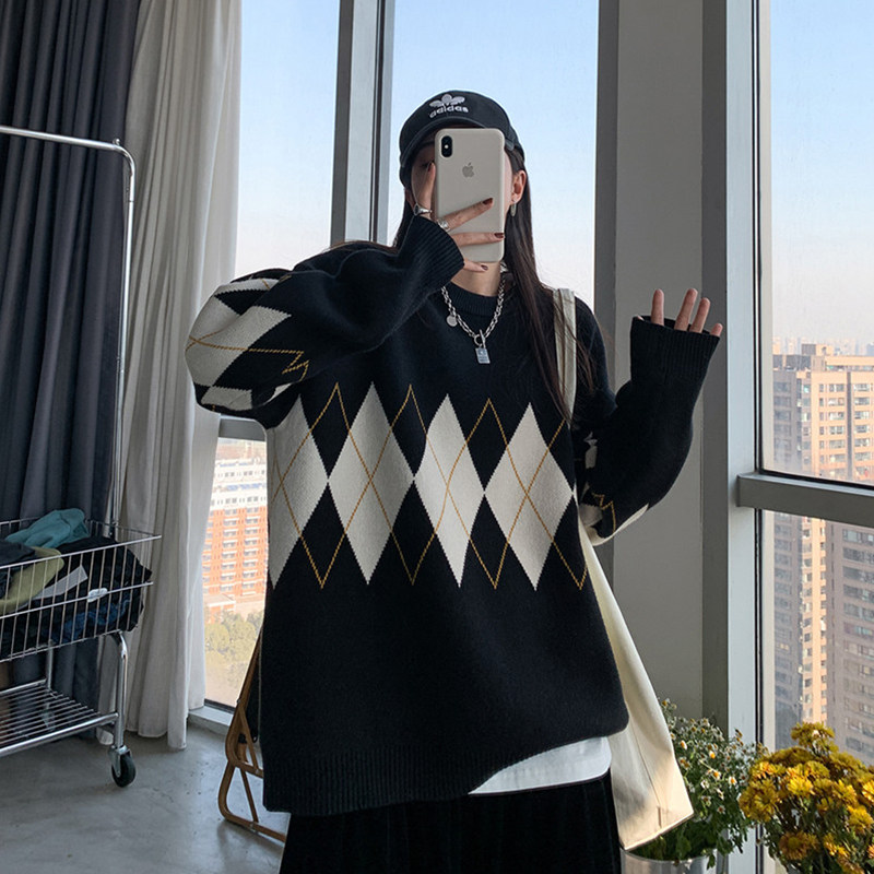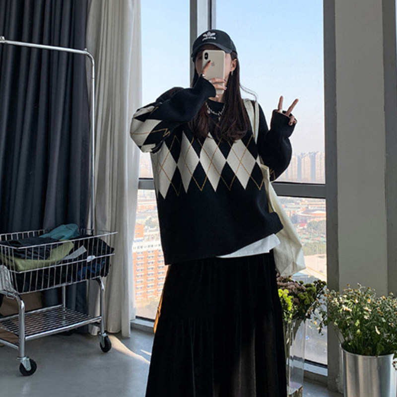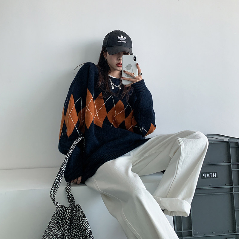 Retro diamond round neck loose knitted sweater ins trendy sweater women's 2022 early autumn design sense niche lazy style