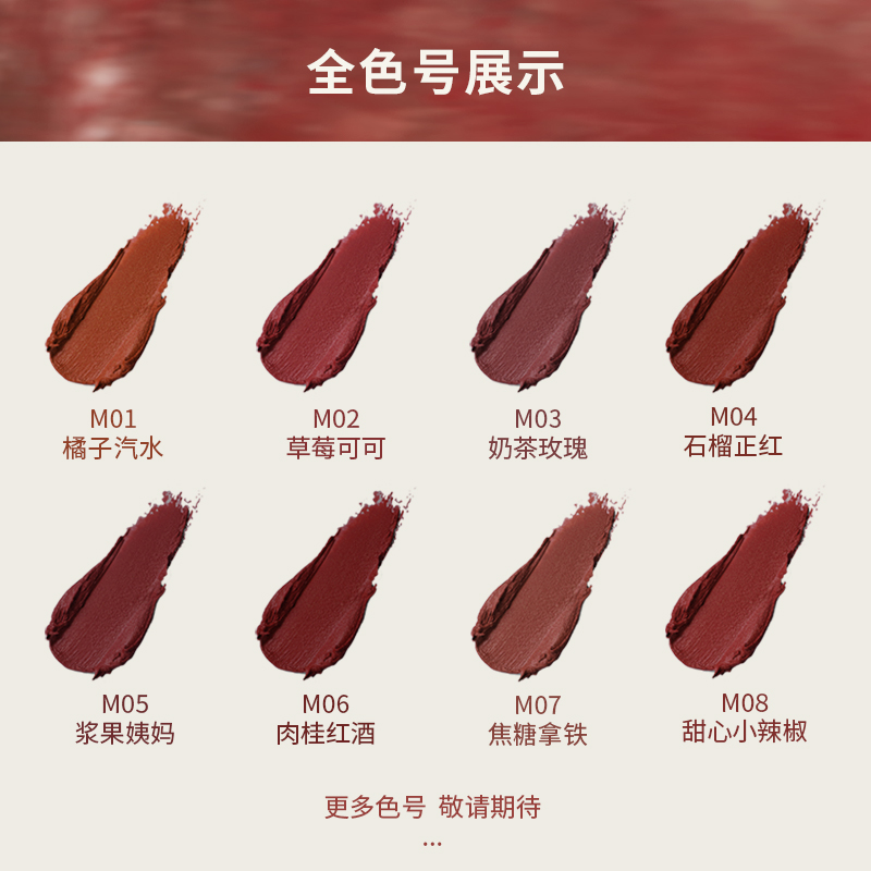 M01 Orange Soda M02 Strawberry Cocoa M02 Pomegranate Red M03 Milk Tea Rose M05 Aunt Berry M06 Cinnamon Red Wine M07 Caramel Latte M08 Sweet