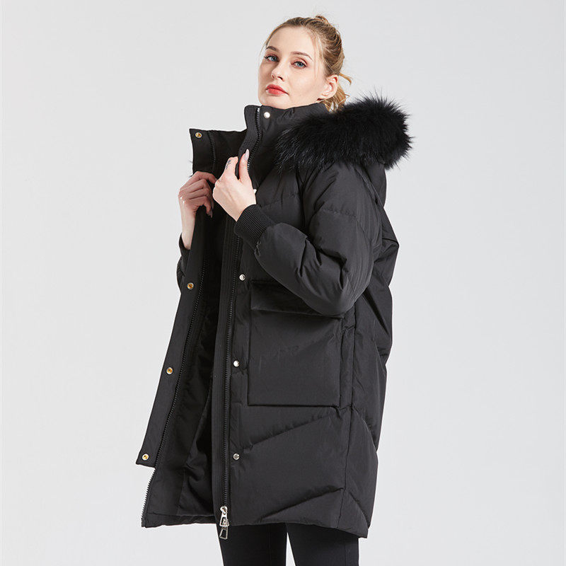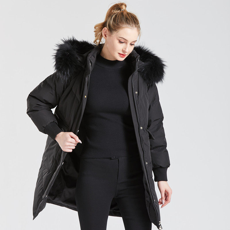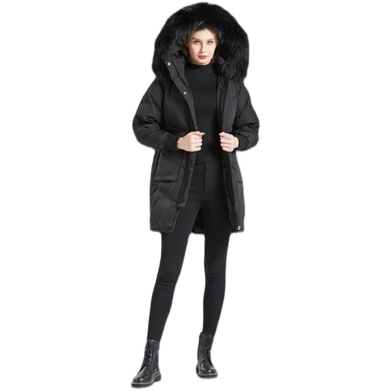 Black medium long version thickened down jacket Female 2021 New Korean version of the slim 350g white duck suede Even cap cocoon type