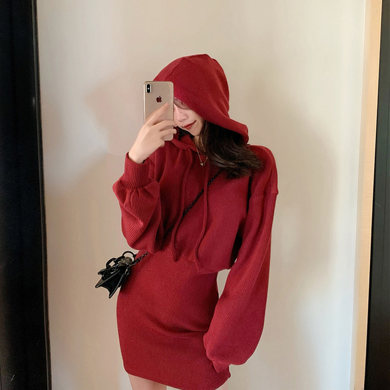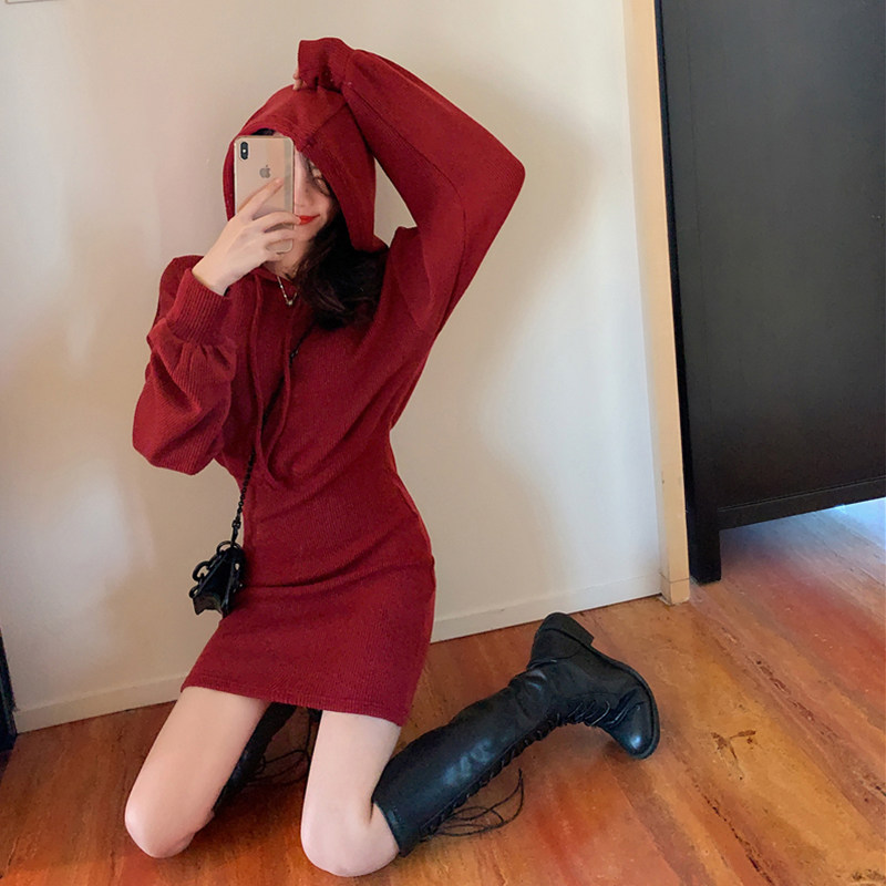 Early autumn 2022 new lazy style dress red Japanese hooded sweatshirt skirt women's design sense is small