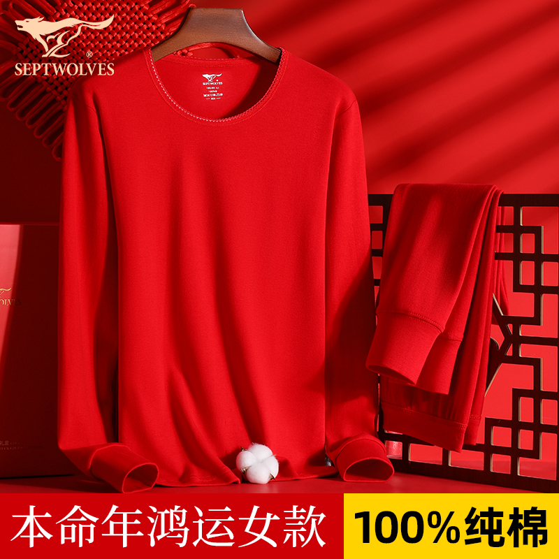Seven Wolves Ben Year Underwear Suit Lady Great Red Pure Cotton Fever Coat Men's Autumn Clothes Sanitary Pants Tiger Year Gifts
