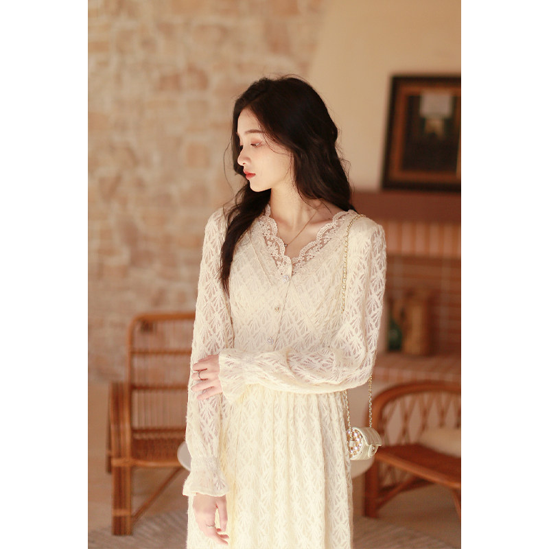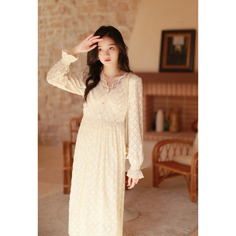 Juku Lace Ocean Dress 2021 Autumn Winter New Long Dress Elegant V Collar Gentle Temperament Lace Dress Children Autumn Winter
