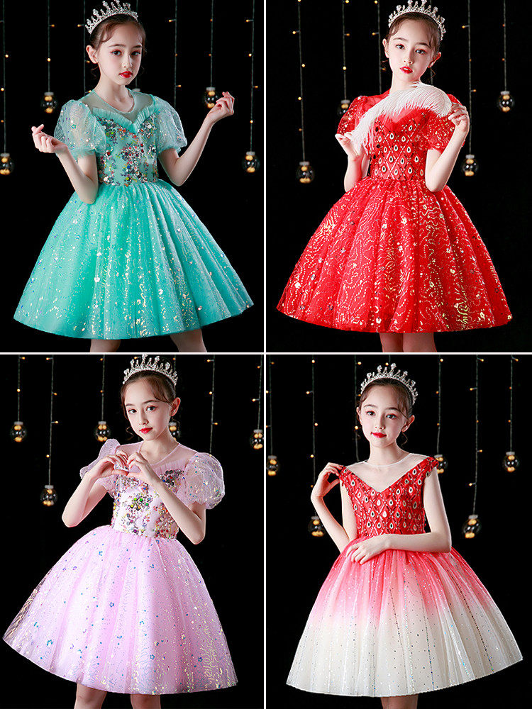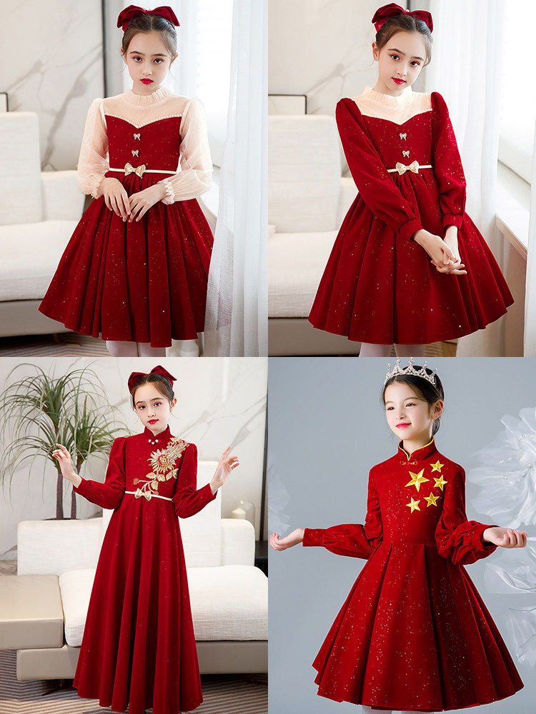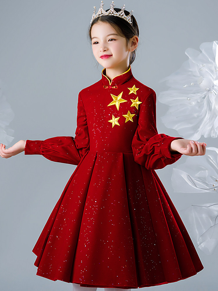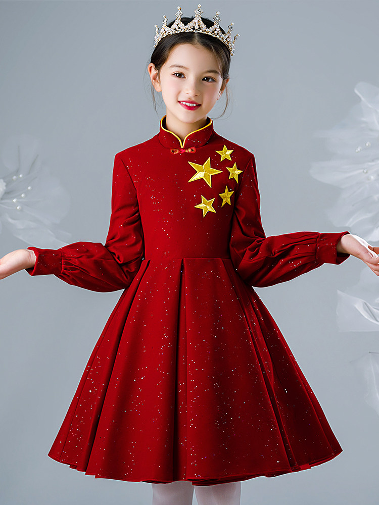 Young host girl dress Princess red Chinese long sleeve high-end children choral suit spring and autumn