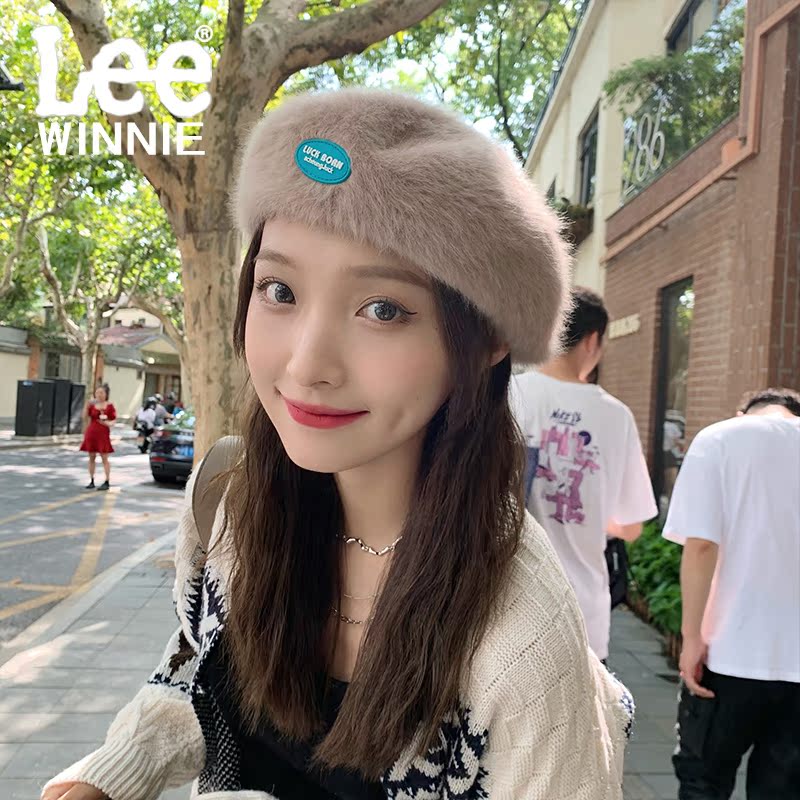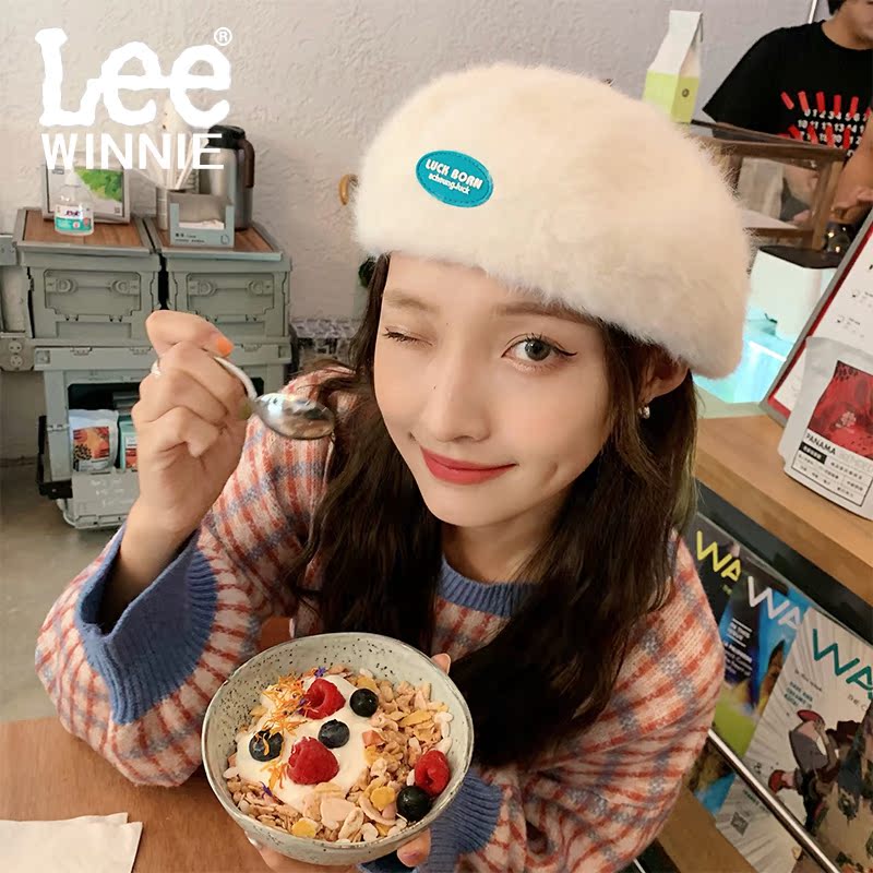 Winnie Lee plush beret female autumn and winter Japanese net red white hat warm bud painter hat tide