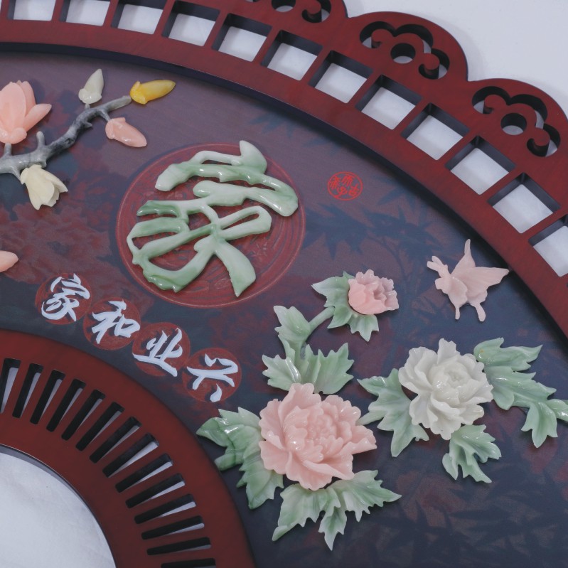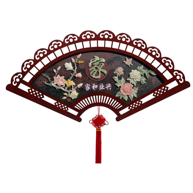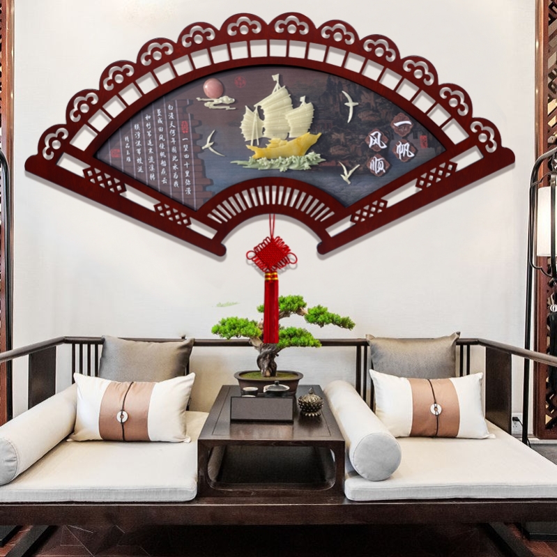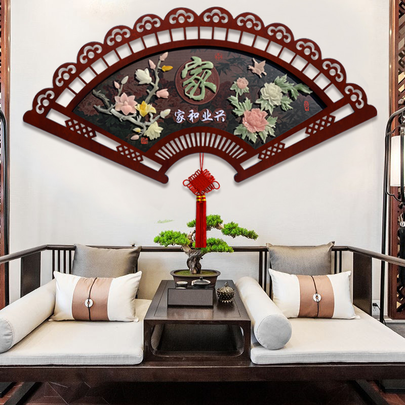 New Chinese fan hanging drawing room decorated sofa background wall relief painting restaurant wall resin jade sculpture