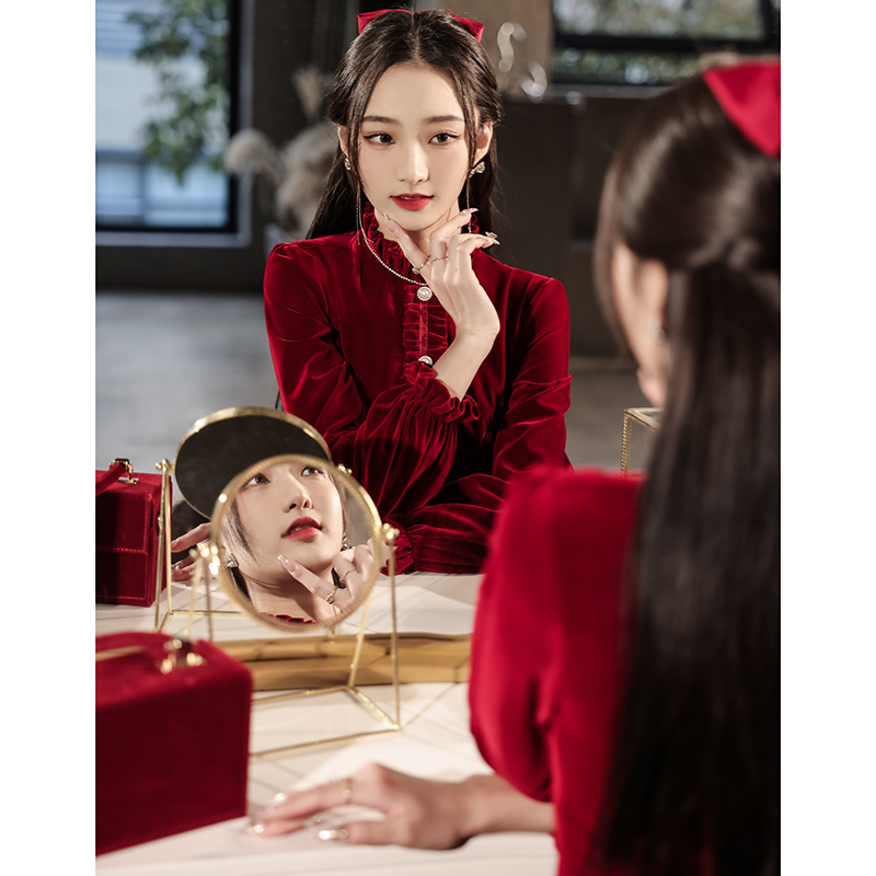 French toast dress bride velvet winter engagement dress skirt female slim long-sleeved wine red back to the door can be worn at ordinary times