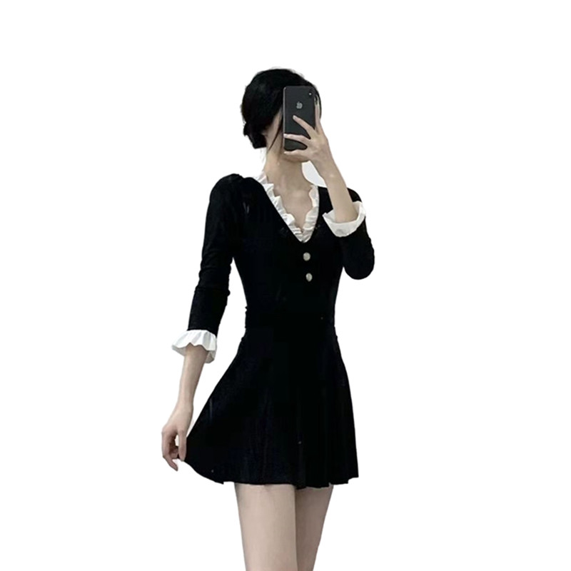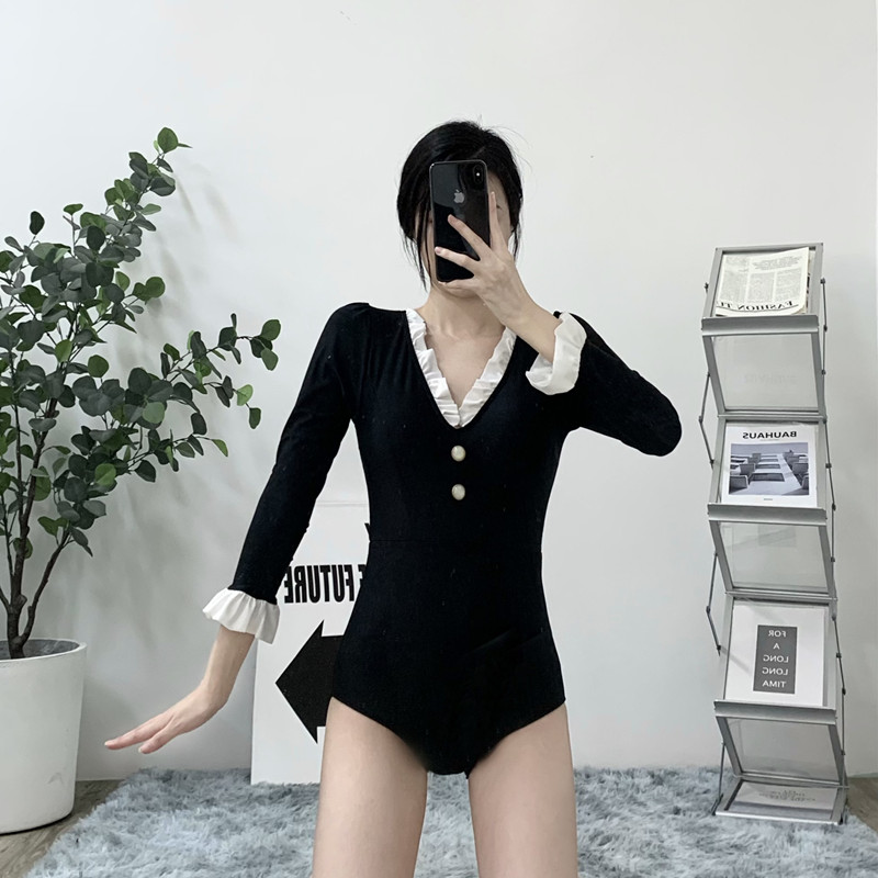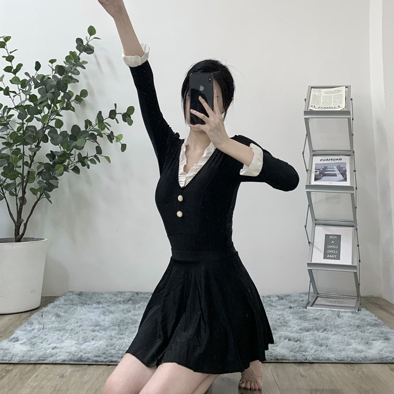 Swimsuit women's 2021 new one-piece black skirt two-piece suit to cover belly and look thin long-sleeved conservative hot spring swimsuit