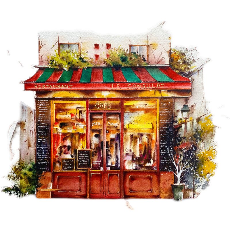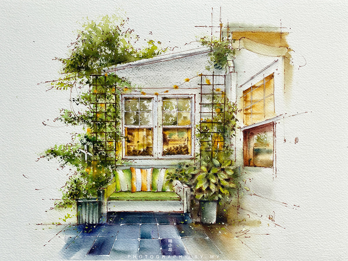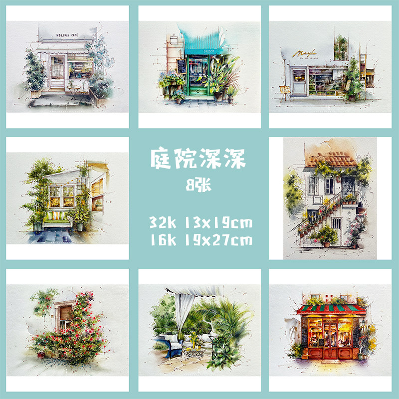Courtyard Deep Ming Flowers Pen Light Color Line Manuscript New Hands Starter Materials Watercolor Line Manuscript Upper Color Hand-painted Building Class