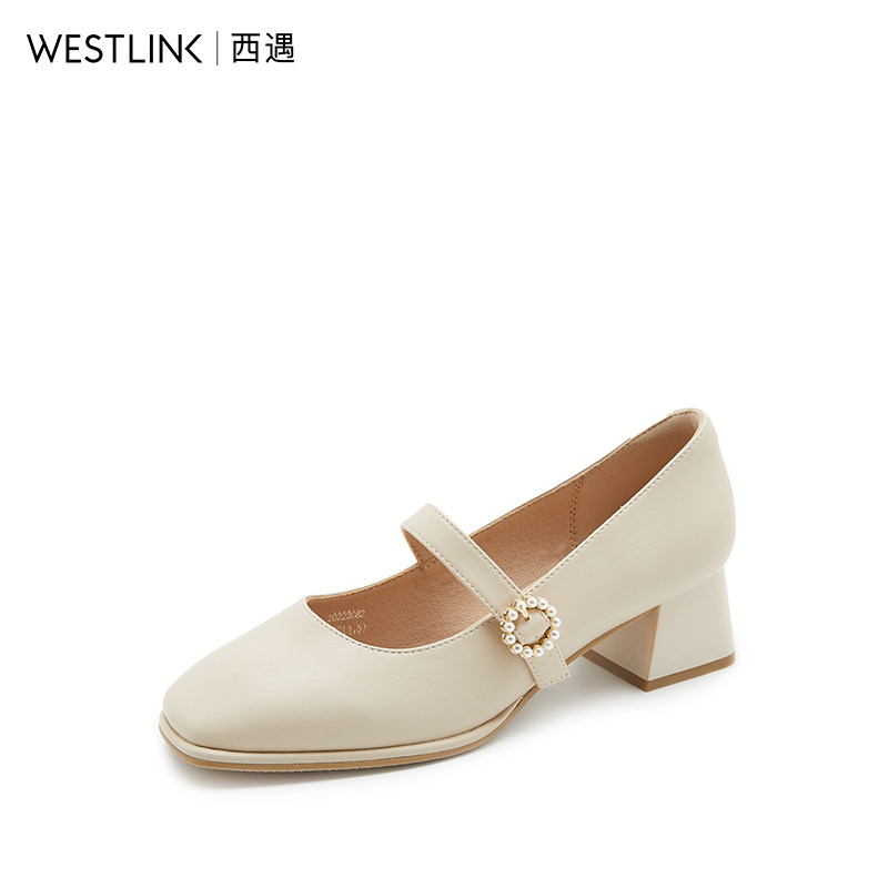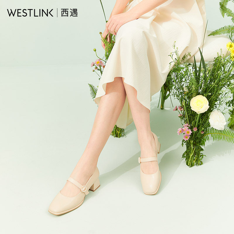 West Encounter Rough Heel Single Shoe Woman Summer 2022 Spring New Retro Pearl Buckle Late Evening Wind Gentle Shoes Square Head Grandma Shoes