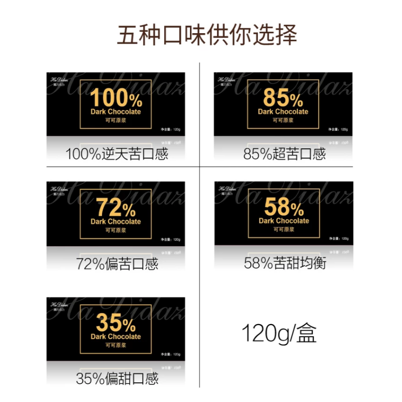 100% cocoa-inverse day bitter 85% cocoa-small bitter and pleasant 72% cocoa-bitter with sweet 58% cocoa-bitter and balanced 35% cocoa-milk chocolate milky white chocolate (new mouth