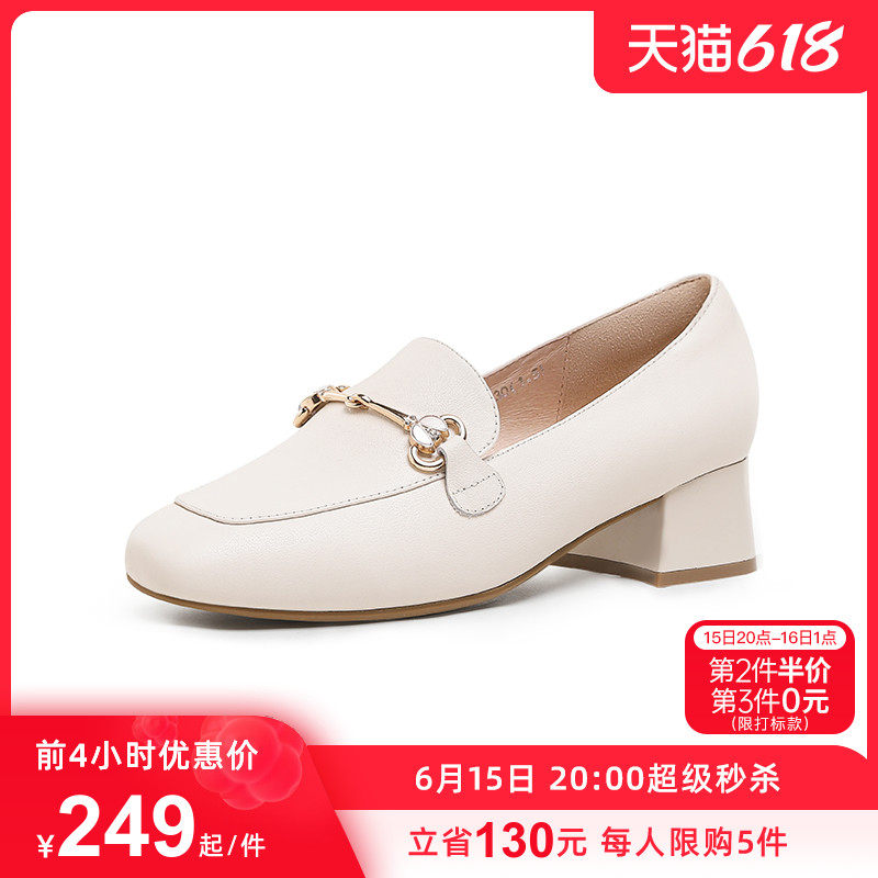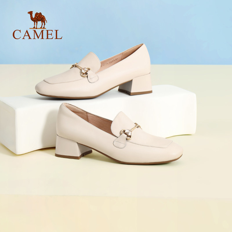 Camel women's shoes 2022 Summer new genuine leather horse title Buckle Yingren Wind Commute Coarse Heel Small Leather Shoes Women Lefu Shoes Single Shoes