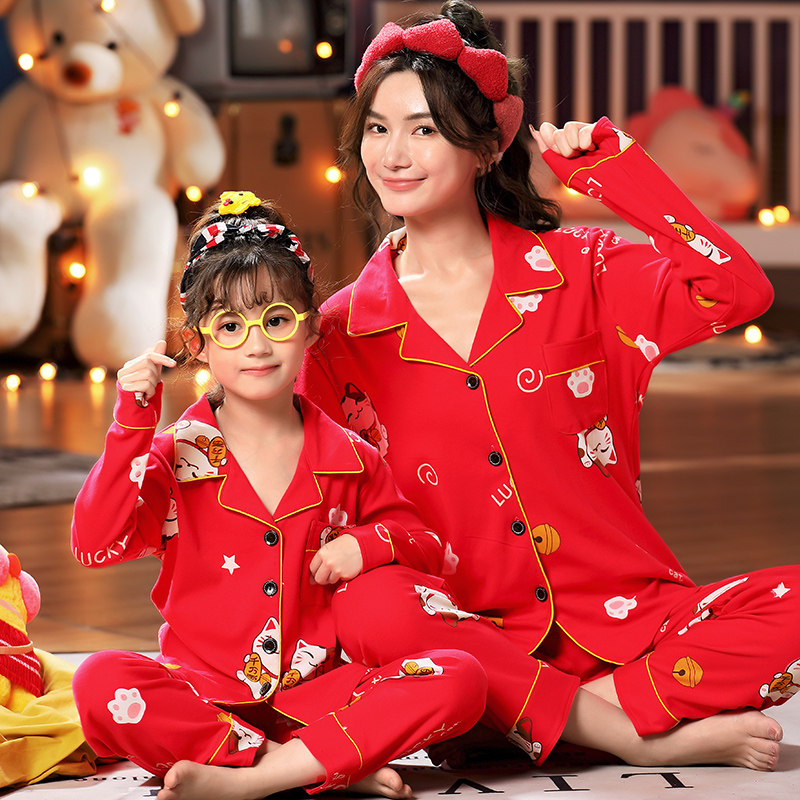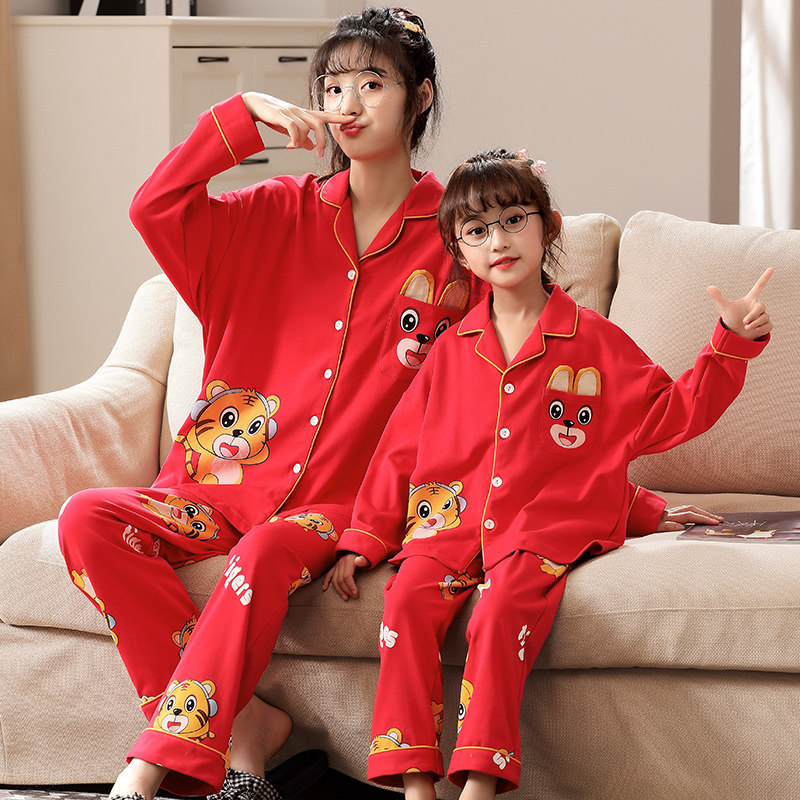 Red New Year's pro-child dress Long sleeve pyjamas A family of three pure cotton female children have stepped up the code home for the year