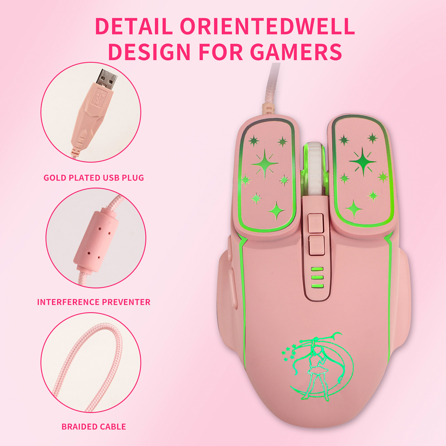 Beautiful girl mute luminous wired mouse girl pink girl heart high value notebook desktop computer game