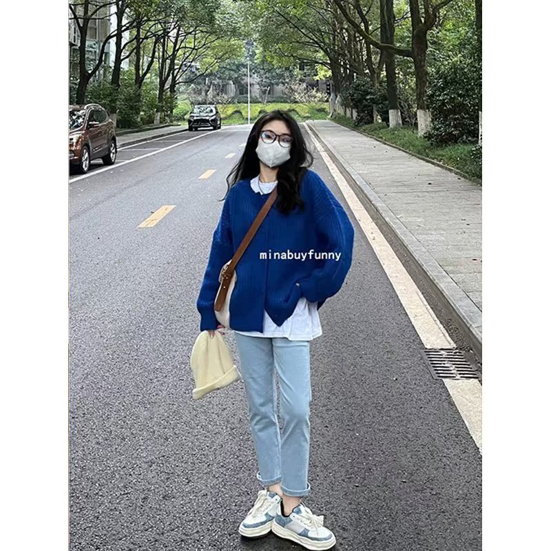 Klein blue knitted cardigan women's 2021 spring and autumn new Korean version all-match loose long-sleeved round neck sweater jacket