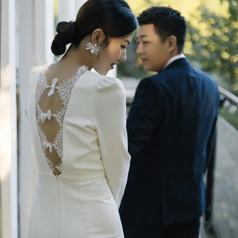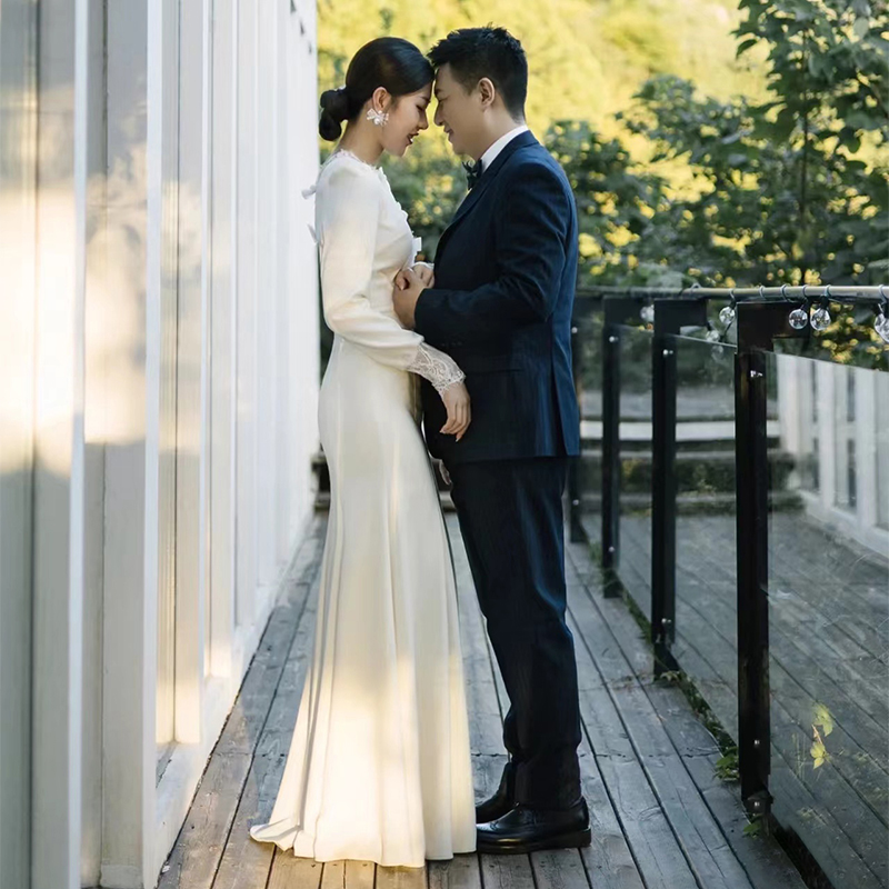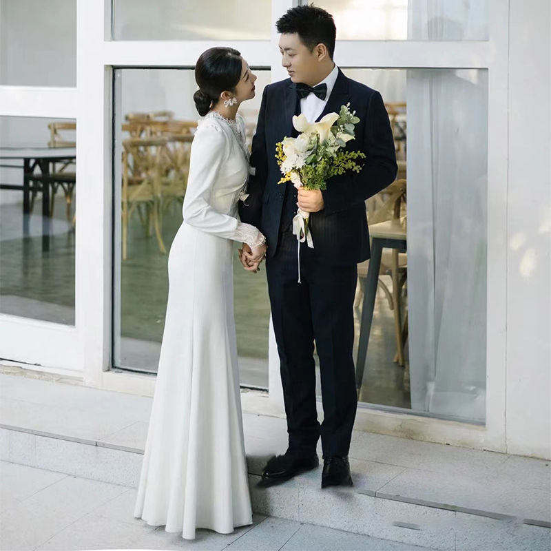 Satin Fish Tail Light Wedding Dress Winter Long Sleeve Fastwear White Brief to greet Pennsylvania Dress Temperament Evening Dress