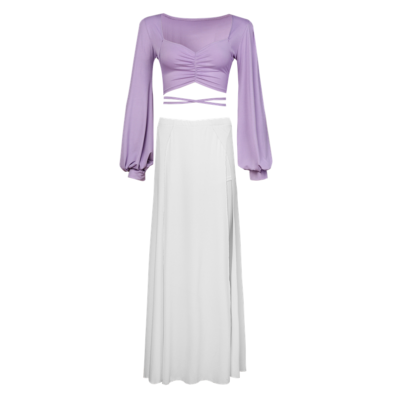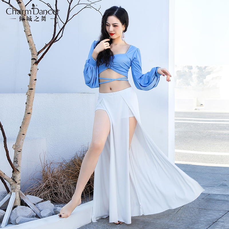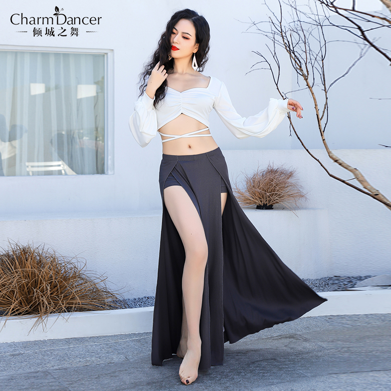The Leaning City Dance New Long Sleeve Belly Leather Dance Practice Style Retro Lantern Sleeve Strap Double Switch Fork Long Dress Practice Group Dress