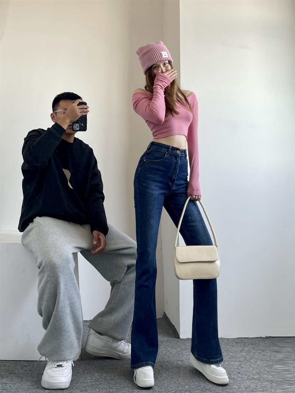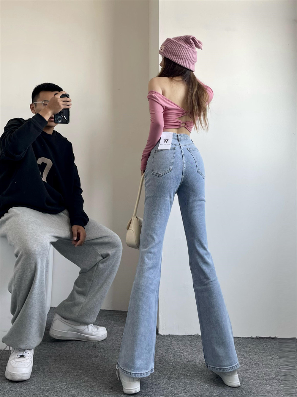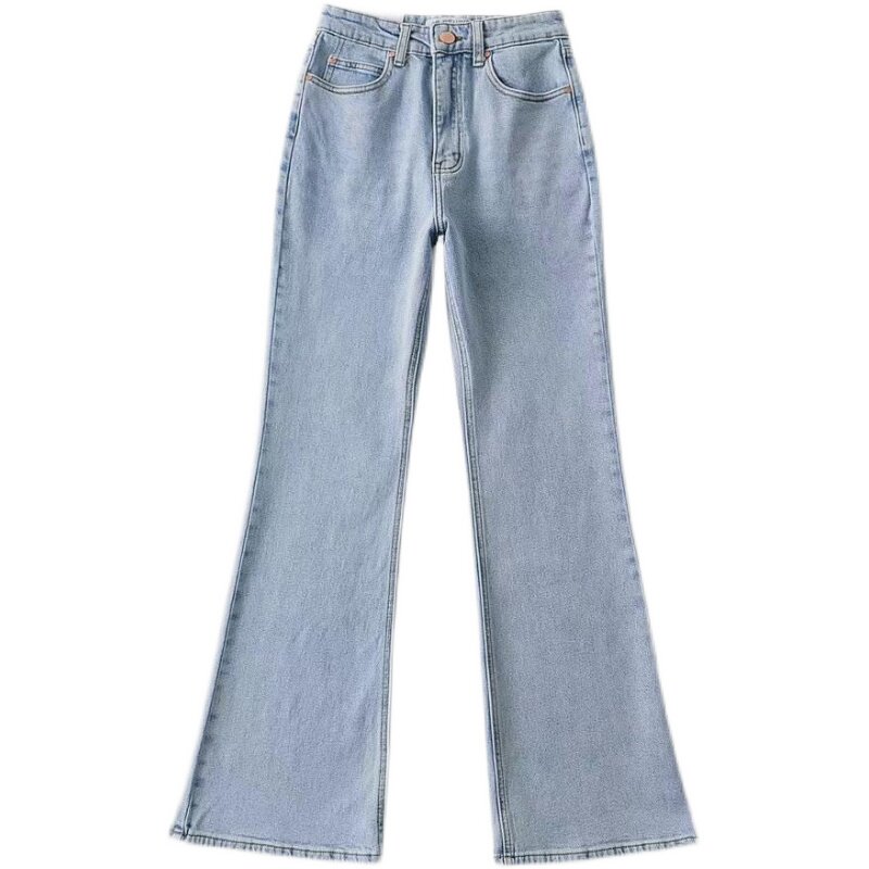 Town store's treasure light blue base Elastic Micro Horn Jeans Long Pants Woman Tug Giant Waist Horseshoe Pants Spring