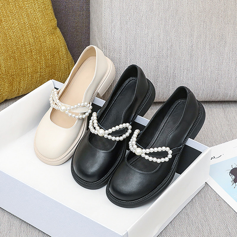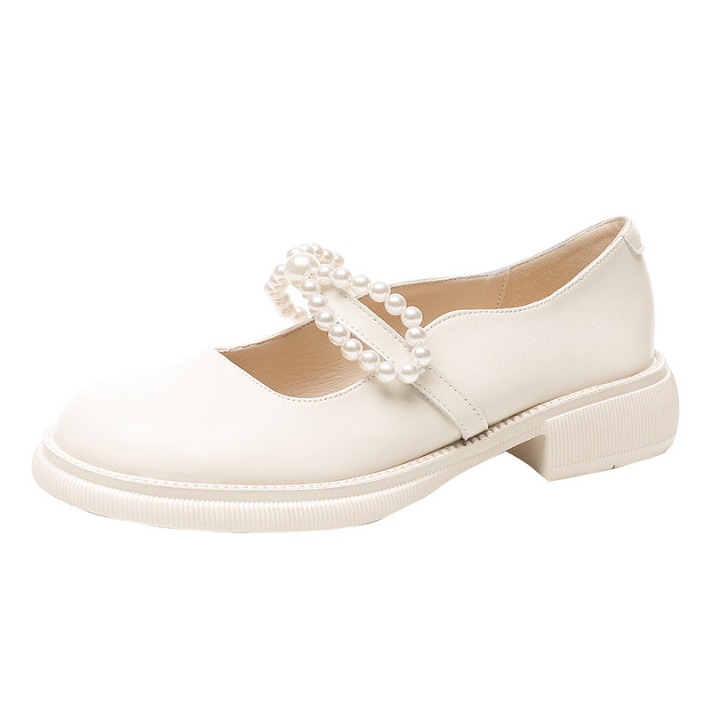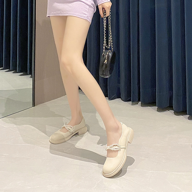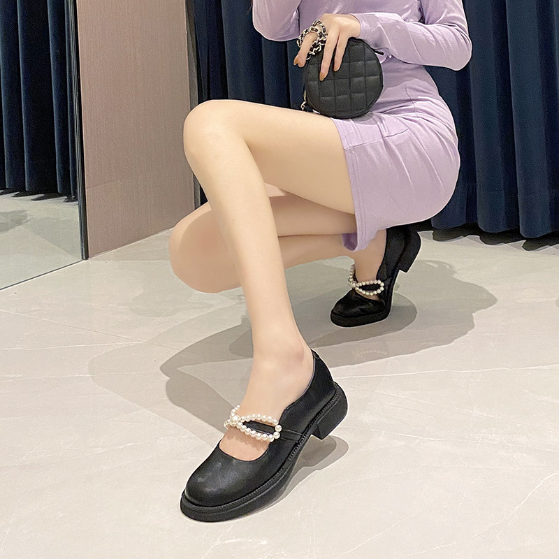 Round Head Small Leather Shoes Woman Little Crowd Design Feeling White Coarse Heel Pearl Mary Rare Shoes Fall Genuine Leather With Lefu Shoes