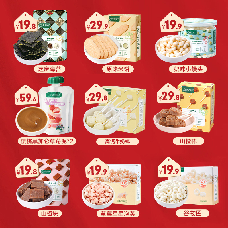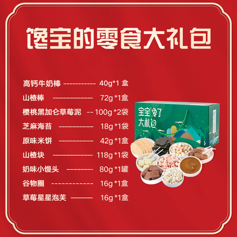 (10 snack packs) Milk stick + hawthorn stick + rice cake + original milk bean + hawthorn block + seaweed + fruit puree * 2 + strawberry star puffs + grain circle 16g (children's day snack package) nut crisp + milk stick + hawthorn stick + rice cake + milk flavor bun 56g * 2 + hawthorn block + pear paste slice + strawberry star puff + grain circle