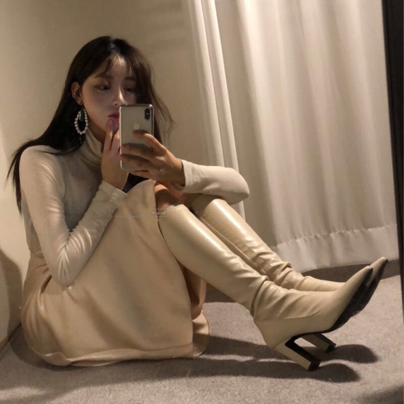 chic strong push self-left ~ explicit legs long Korean rice white pointed coarse high heel slim slim boot high cylinder boots long boot