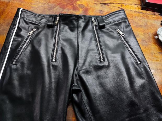 Design custom thick top layer cowhide pants double zipper color strip slim motorcycle windproof leather trousers men's tide