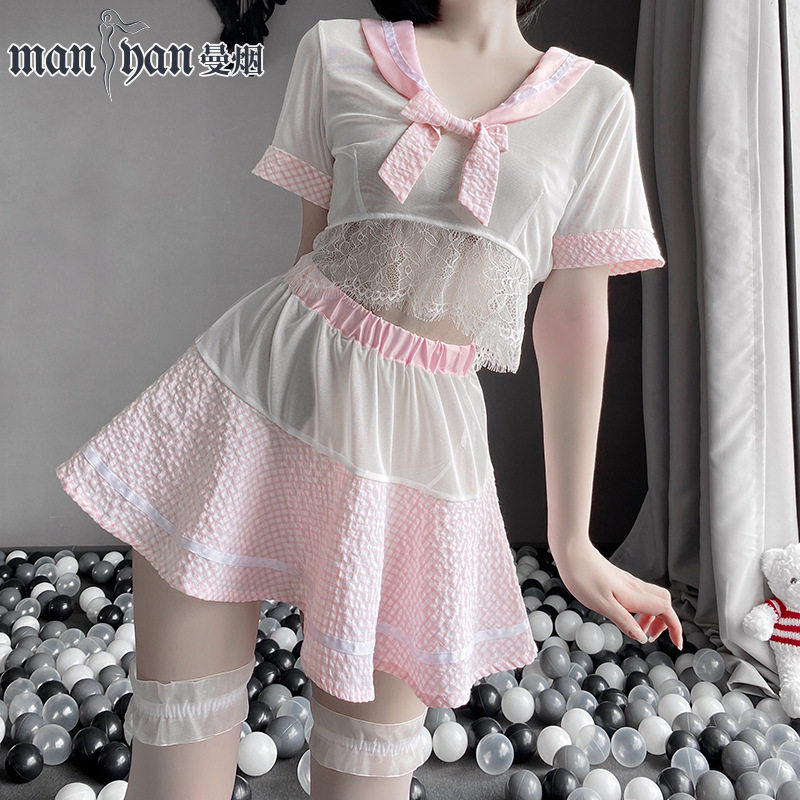 Sweet pink school girl sailor suit sexy perspective lace lace plaid JK uniform suit soft girl temptation