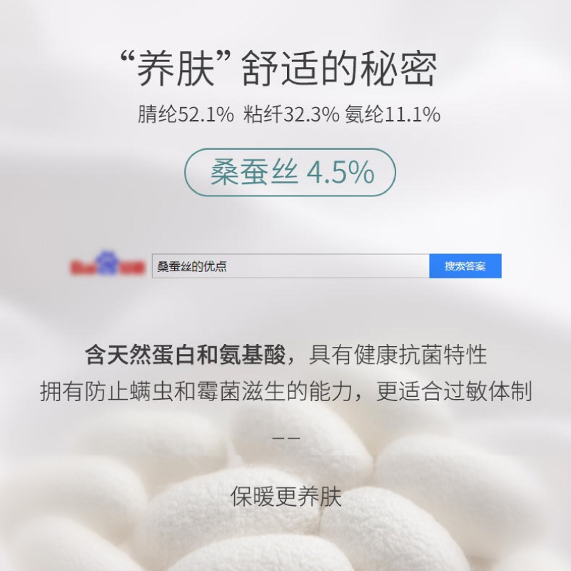 New polyester fiber 48 9% Polyacrylic fiber (acrylic fiber) 22 9% regenerated cellulose fiber 17 7% polyurethane elastic fiber (spandex) 7% mulberry silkworm