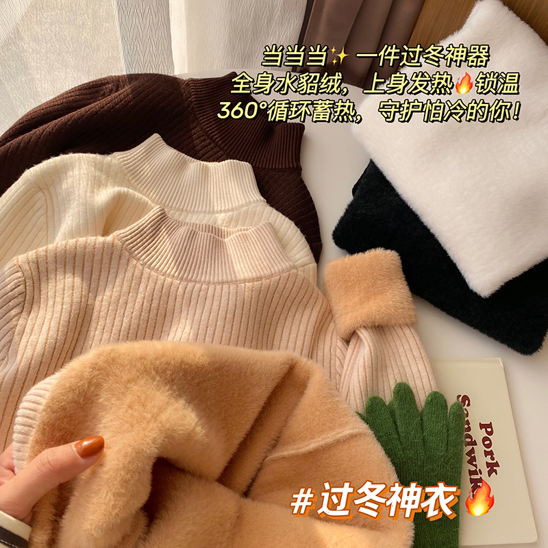 Sweater women's winter 2023 new thickened plus velvet semi-high collar bottom-shirt autumn winter internal lap integrated suede white blouses-Taobao