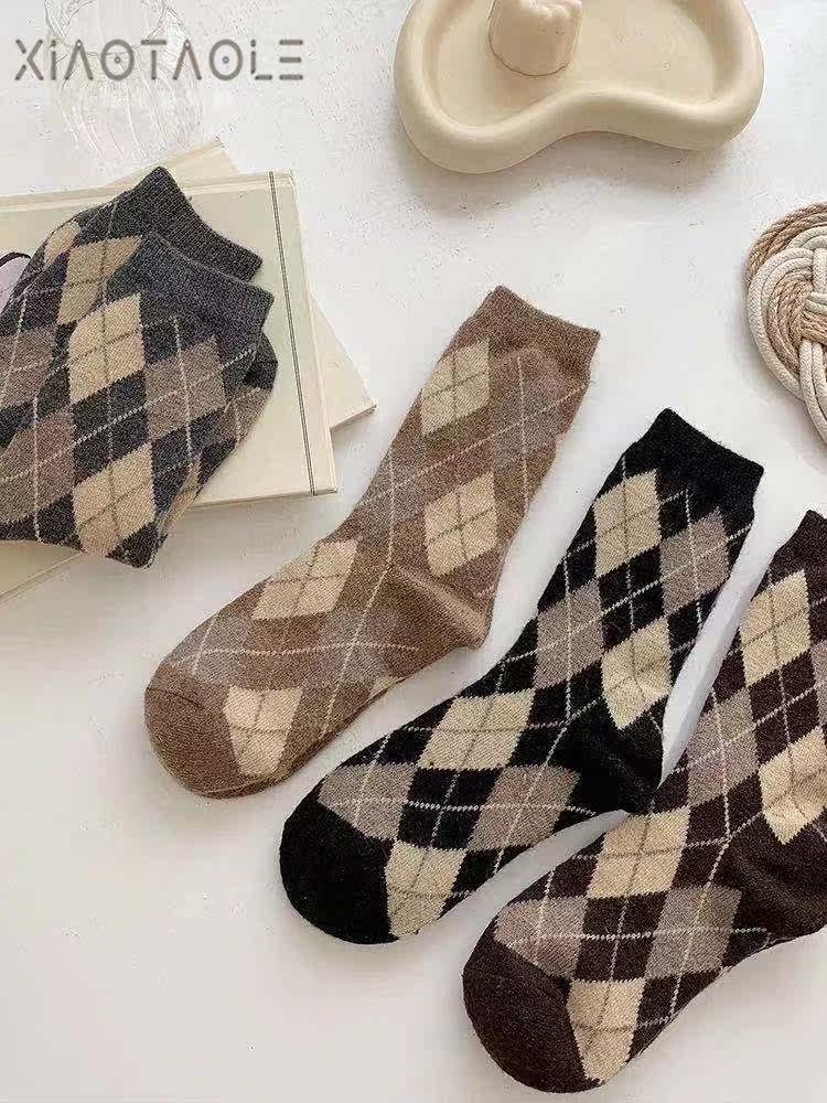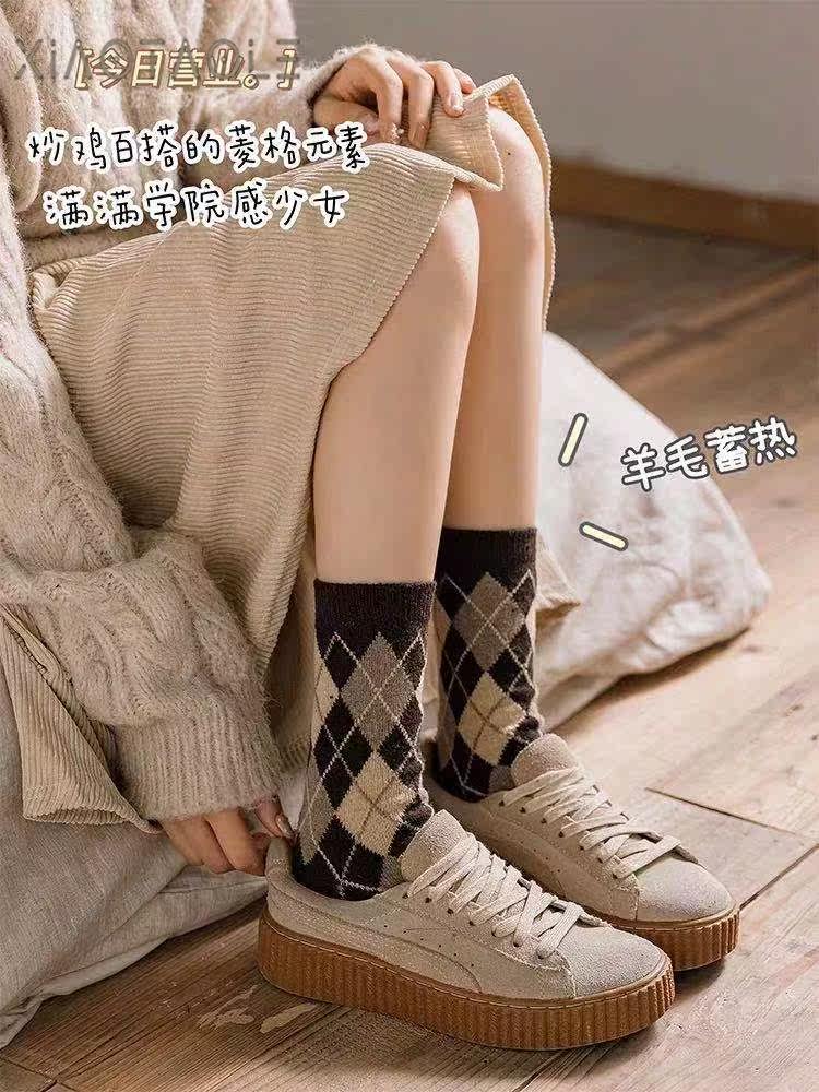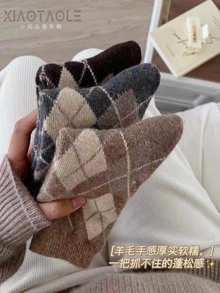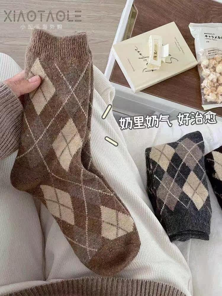 Japanese Lingge wool socks warm mid-tube socks women's winter thickened stockings autumn and winter brown ins tide socks