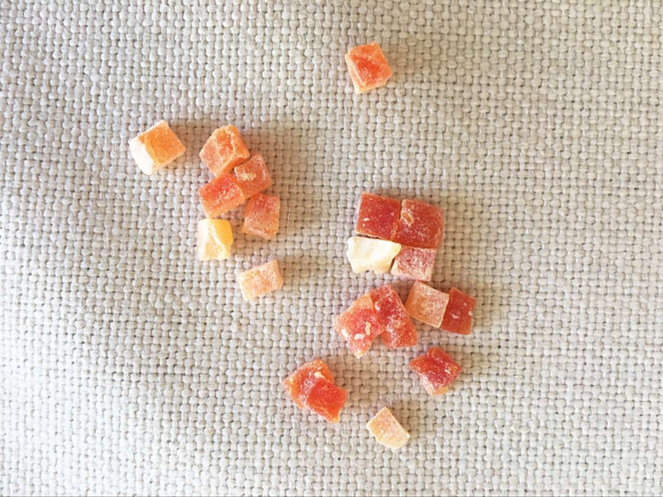 30g papaya particles 30g fragile coconut 20g apple grain 20g frozen dry strawberry particles 40g cheese 240g fragile papaya particles 150g fragile coconut 100g apple grain